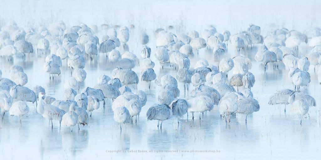 Még kártyákon pihennek a képek. De egy gyors pillantást vetve az első nap anyagára ezt találtam. Hajnali párában ébredező Kanadai darvak a Rio Grandén...