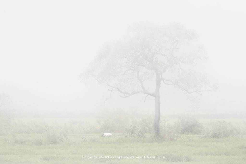 Nyáron nem gyűlnek össze a madarak, mint télen, viszont a japán darvak nem is költöznek! Nappal a kettő, négyfős családok kis csoportjai tűnnek fel szerte a tájban. Kicsit elővigyázatosabbak, mint télen, táncukat sem mutatják, de remekül komponálhatók ebben a nyár végi ködös időszakban.
