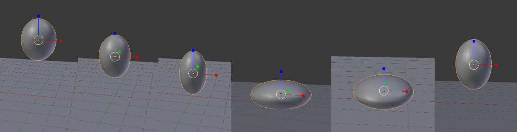 Lépjünk az ötödik frame-re, emeljük egy kicsit lejjebb a gömböt, nyújtsuk meg a Z tengelyen és zsugorítsuk ezzel arányosan az X és Y tengelyeken. Így azt a hatást kelti, hogy viszonylag nagy sebességgel a föld felé esik. Fixáljuk le a keyframe-et az [I] gombbal.