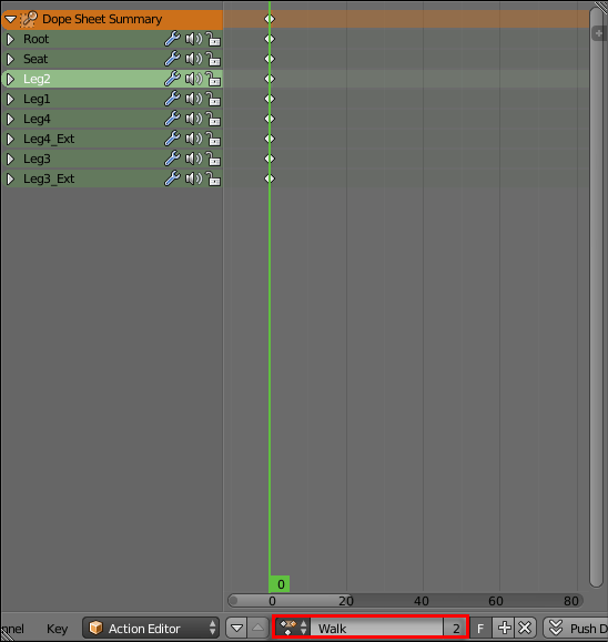 Nevezzük át az alap animációt Walk-ra a Dope Sheet ablakban. A továbbiakban ebben a lenyíló menüben választhatjuk ki az éppen szerkeszteni kívánt animációt. Ahogy előzőleg, most is az Action Editor módot használjuk.