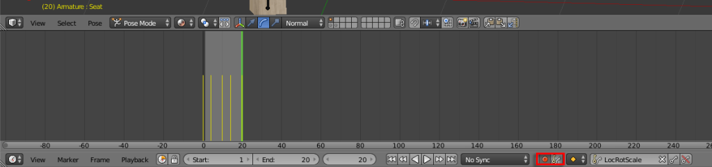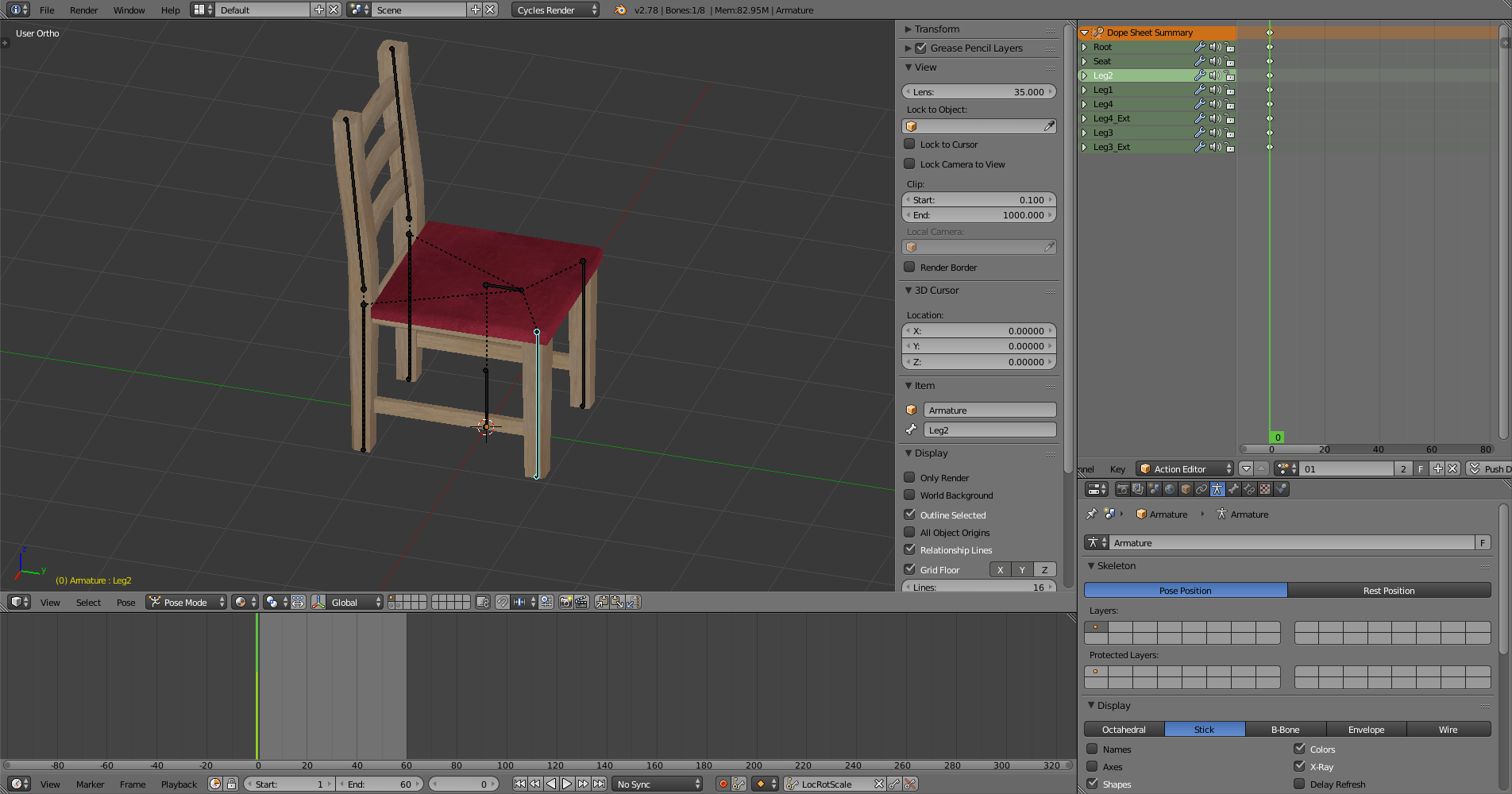 A szék esetében csontpozíciókat fogunk használni, tehát Object mode helyett Pose mode-ra kell váltanunk. Fontos figyelembe vennünk a csontok hierarchiáját - például azt, hogy az ülőke alárendeltjei a lábcsontok, tehát ha az ülőke elmozdul, a lábcsontok is vele mozdulnak.
