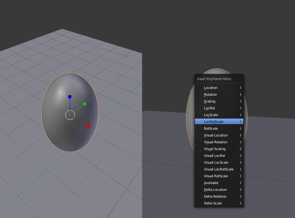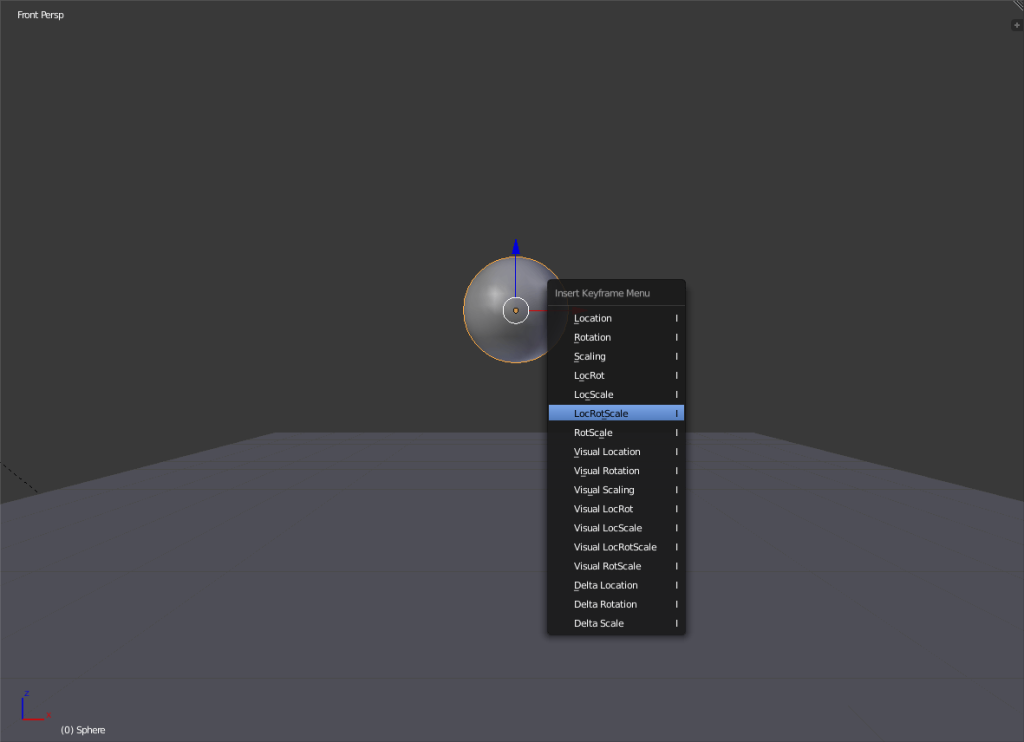A keyframe rögzítéséhez az [I] gombot kell lenyomnunk, a viewport ablakban megjelenő menüben pedig a LocRotScale opcióra kattintsunk. Így a gömbünk jelenlegi pozíciója, rotációja és mérete rögzítésre kerül egy keyframe formájában. Helyezzünk is el egy keyframe-et az első frame-re.