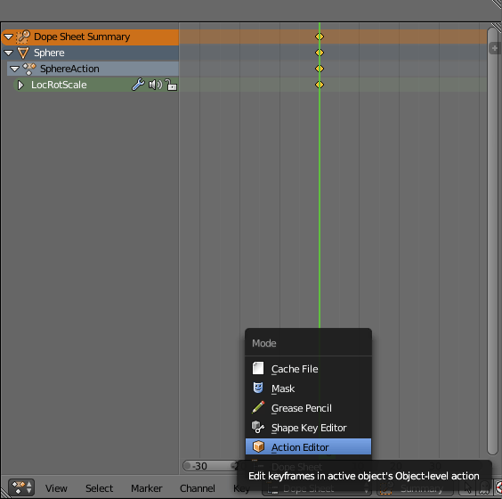 Ezek után 5 frame-enként készítsünk keyframet a képen láthatóhoz hasonló pózokról. A keyframe-eket a Dope Sheet ablakban tudjuk manipulálni, viszont objektum animáláshoz a legjobb az Action Editor mód, tehát állítsuk is át. Így nyomon követhetjük a létrehozott keyframeket, és az eddig megismert mozgatási módokkal mozgathatjuk is őket a frame-eken (jobb klikk - kijelölés, [G] - mozgatás, [shift + D] - duplikálás).