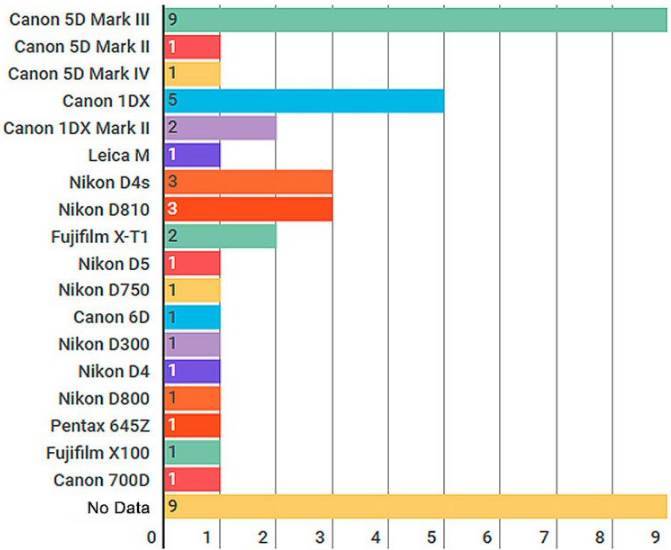 Fenti ábrán remekül látszik, hogy mely gépekkel hány díjat hoztak el a jelöltek, és már itt megfigyelhető, hogy a Canon és a Nikon uralják a terepet, ám érdekes lehet, hogy a Canon 5D Mark VI, és az 5DS/5DS R helyett a Canon 5D Mark III a domináns, mint ahogyan az elmúlt években is az volt.