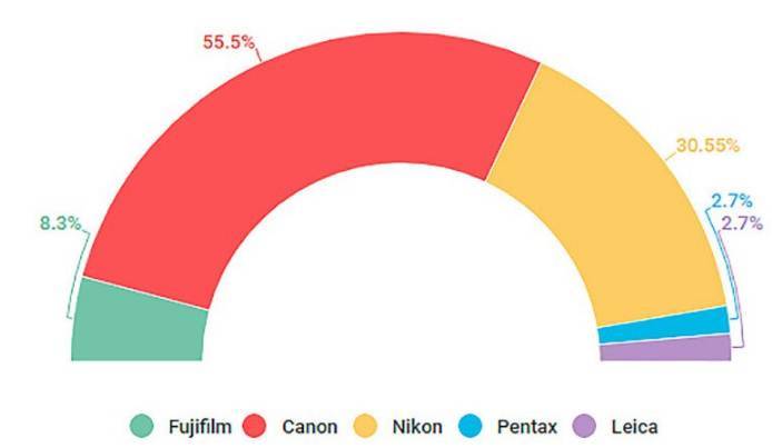 Alábbi diagramon pedig megfigyelhetjük, hogy az előbb említett két gyártó mellett a Fujifilm is feltörekvőben van, illetve azt is érdemes tudni, hogy a DSLR gépek aránya 88,8 százalék a győztesek mezőnyében, míg a "tükörtelen" és az egyéb masinák egyaránt 5,55 - 5,55 százalékkal képviseltetik magukat.