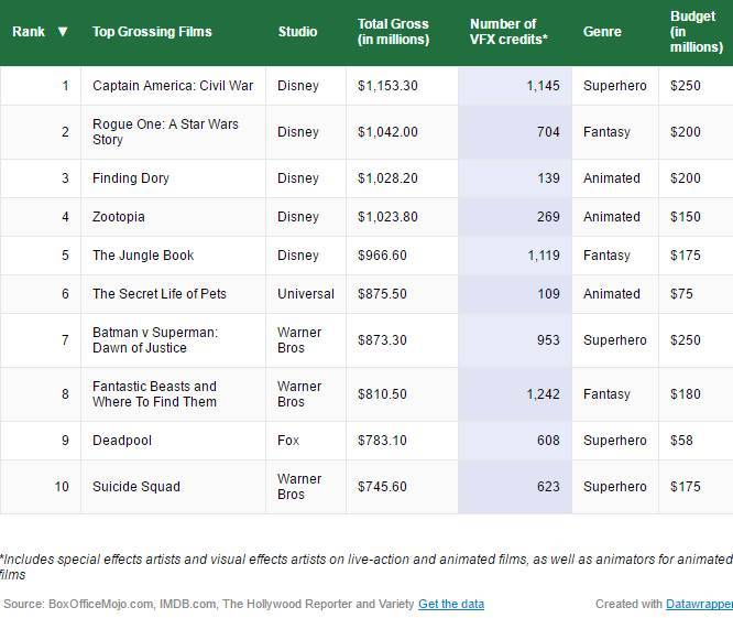 Alábbi táblázatból szépen látszik, hogy mennyien dolgoznak VFX téren egy filmen, de ugyanitt leolvashatóak a költségek és a bevételek is.