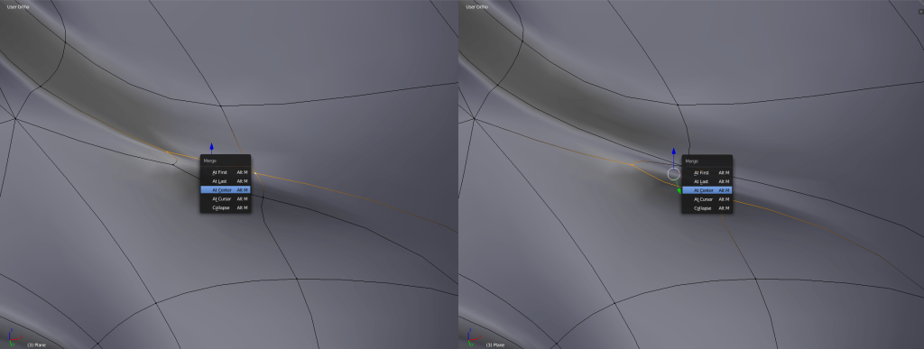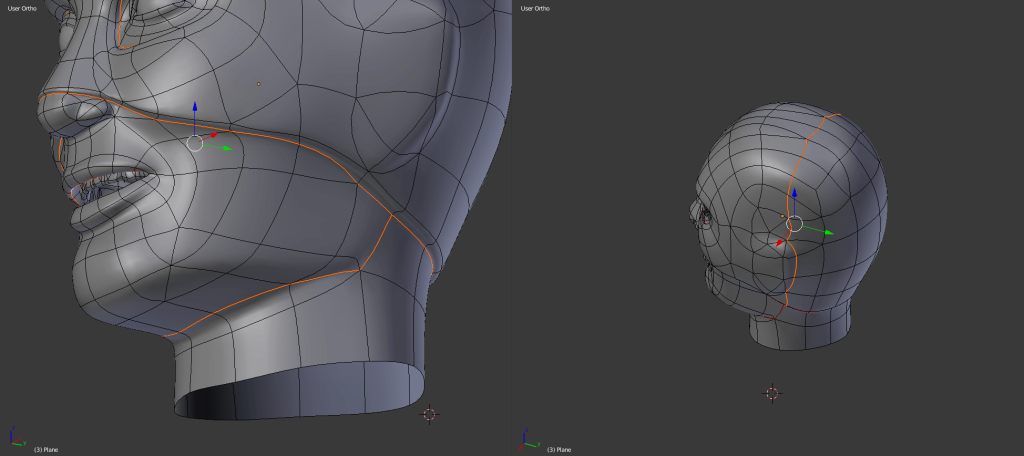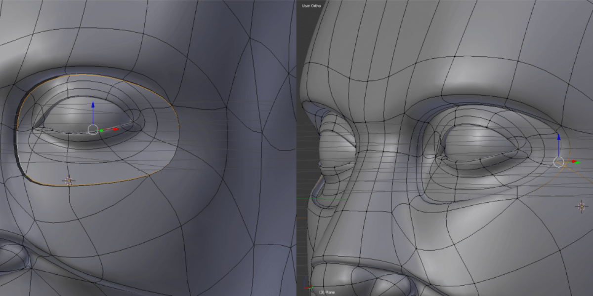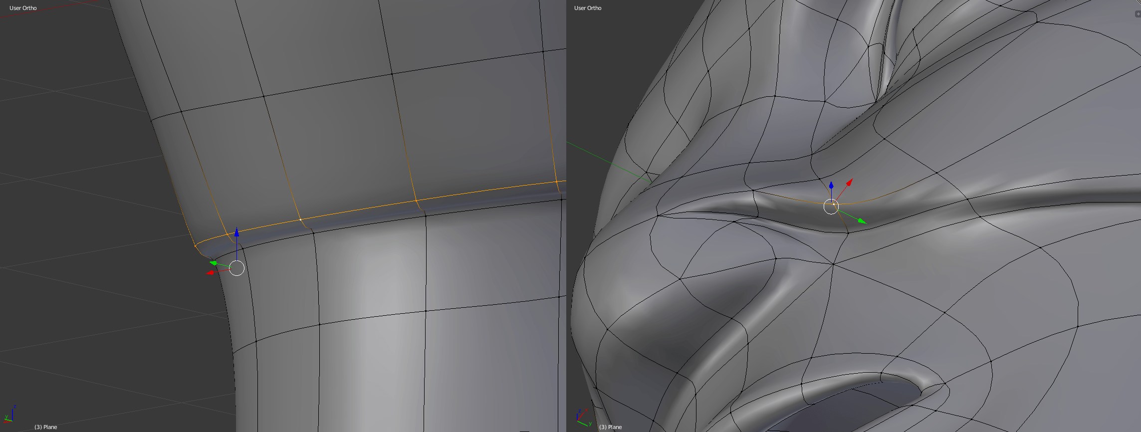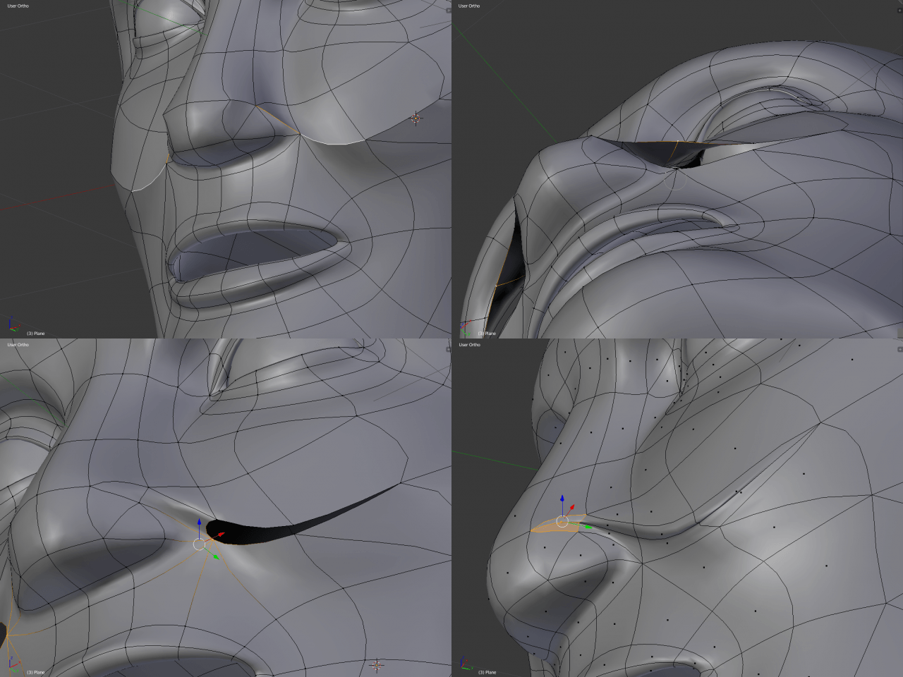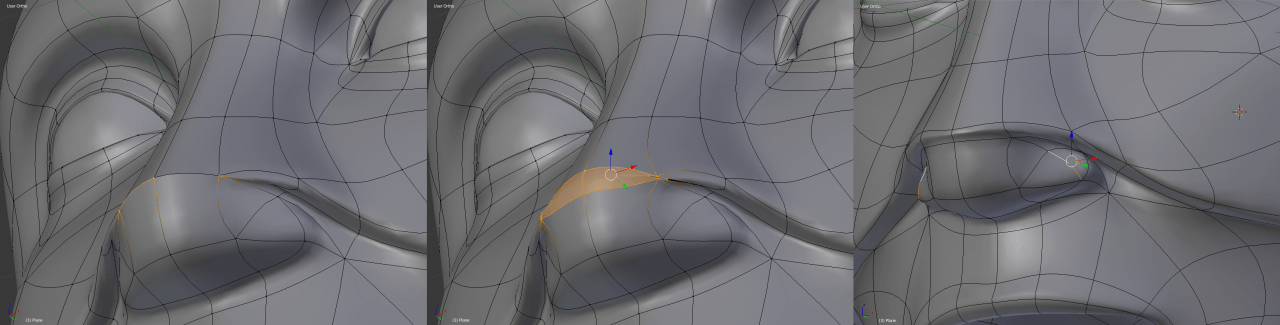 Nyessük meg az arcot az orr mellett és a felső élet kissé mozdítsuk el. Ezután az orr szélétől leválasztott vertexet emeljük kicsit távolabb az eredeti pozíciójától. Alkossunk felületeket a létrejött szakadásban, legyen egyenletes, hogy az összekötésük után rakhassunk rá egy edge loop-ot.
