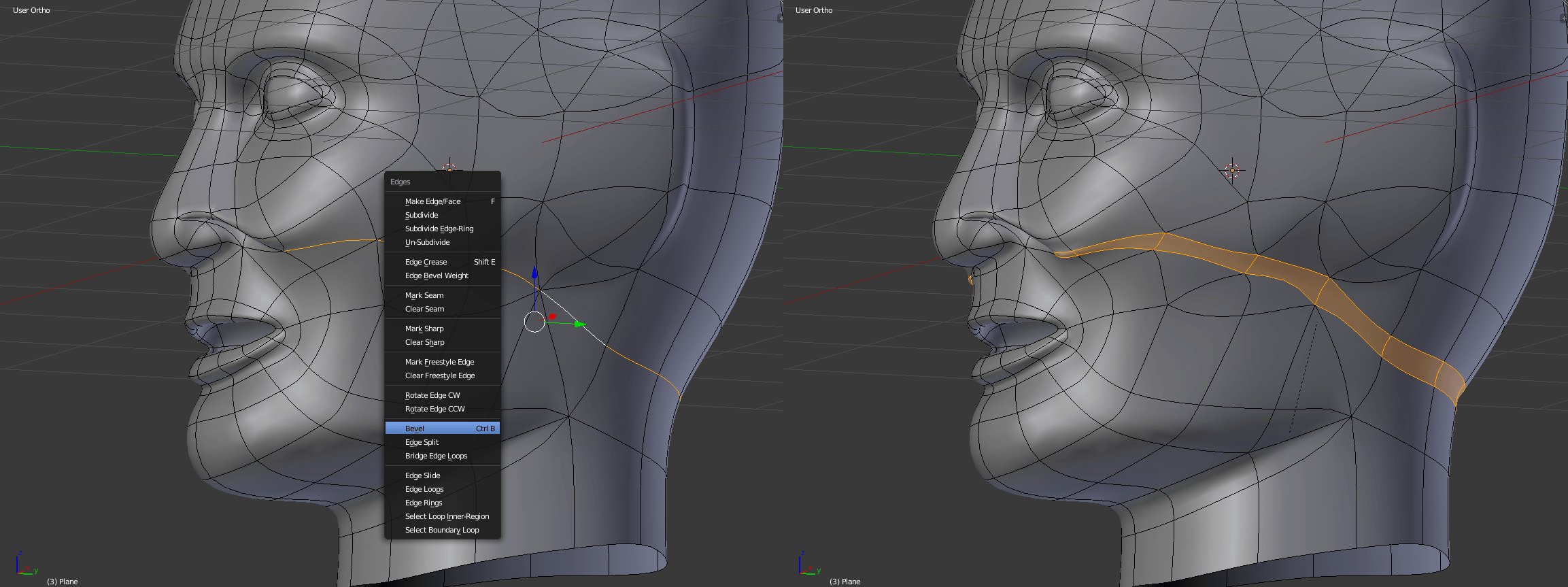 Ha ez megvan, igazítsuk, akkor jó, ha kicsit domborúnak hat a maszk alsó oldala. Ezután jelöljük ki a többi élt, amik mentén a maszkot szeretnénk létrehozni, és beveleljük azokat.