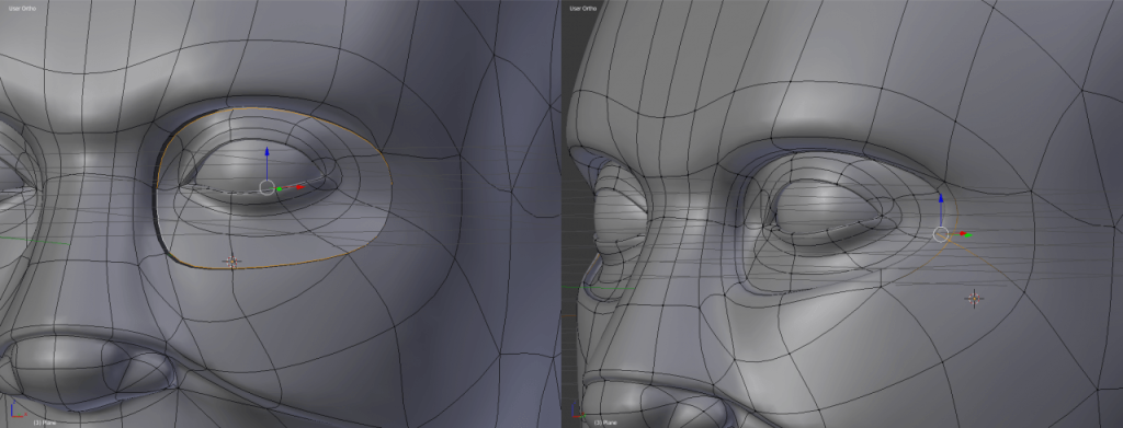 A kivágott gyűrűt óvatosan mozdítsuk kicsit beljebb, a szemgolyó felé; a maszk éleit pedig  kijjebb. Ha ez megvan, akkor megintcsak hozzunk létre az elválasztott felületek között új face-eket.