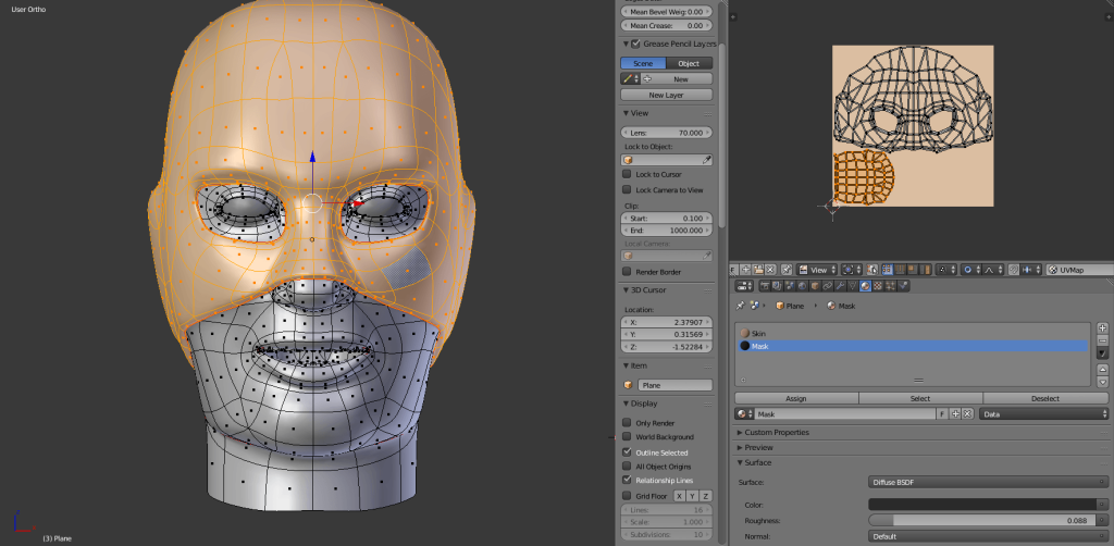 Ezzel nem csak a UV-k vágását jelölhetjük, de ha vertex vagy edge helyett face kijelölési módban nyomunk Ctrl+[L]-t, akkor a seam megállítja a kijelölést, így könnyebben tudunk egybefüggő felületeket kijelölni. Jelöljük ki a maszk elejét, tehát a fülekig bezárólag a szemből látható felületeket. Jelenleg még fontos a szimmetria, legyen pontos a kijelölés!