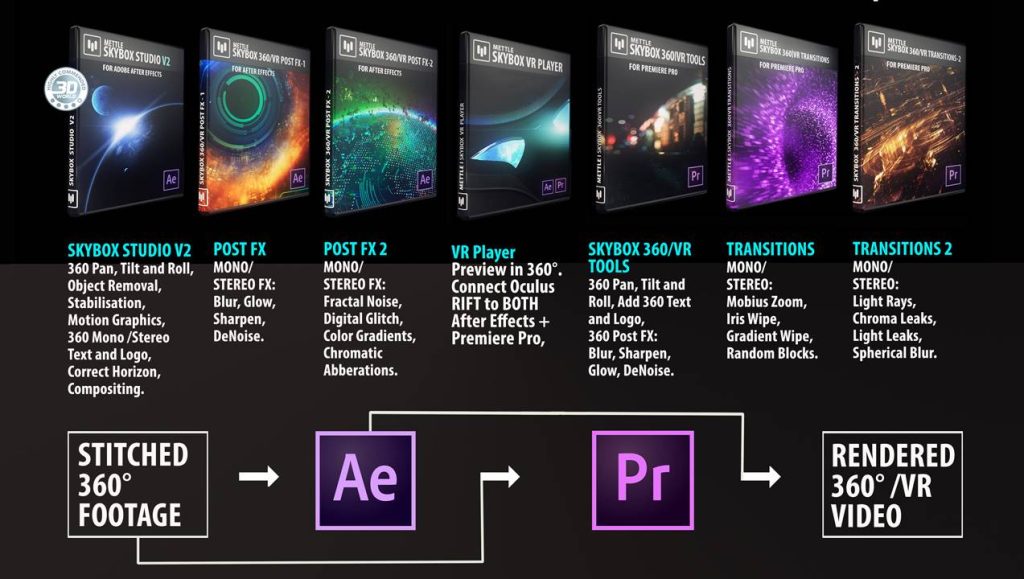 A SkyBox Suite, amelyet az Adobe megvásárolt a következő plugineket foglalja magába: Skybox Studio V2, Post FX, Post FX 2, VR Player, SkyBox 360/VR Tools, Transitions és Transition 2. Ezek segítségével gyorsan és egyszerűen készíthetünk profi 360 fokos tartalmakat, amelyeket aztán az Adobe szoftvereiben akár VR-headsettel (Oculus Rift vagy HTC Vive) meg is nézhetünk.