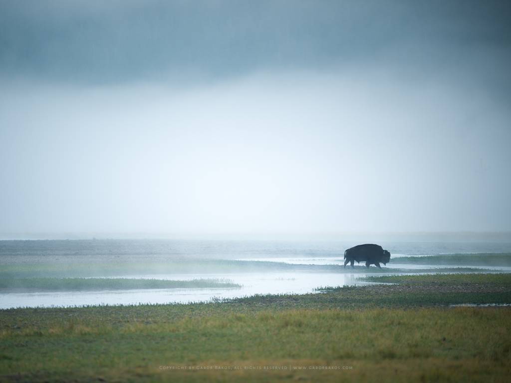 A sárban cuppogva haladva kerestük az állatokat. Kellett a figyelem. A köd nehezítette a tájékozódást és nem akartunk szembekerülni egy ideges bölénnyel vagy medvével.