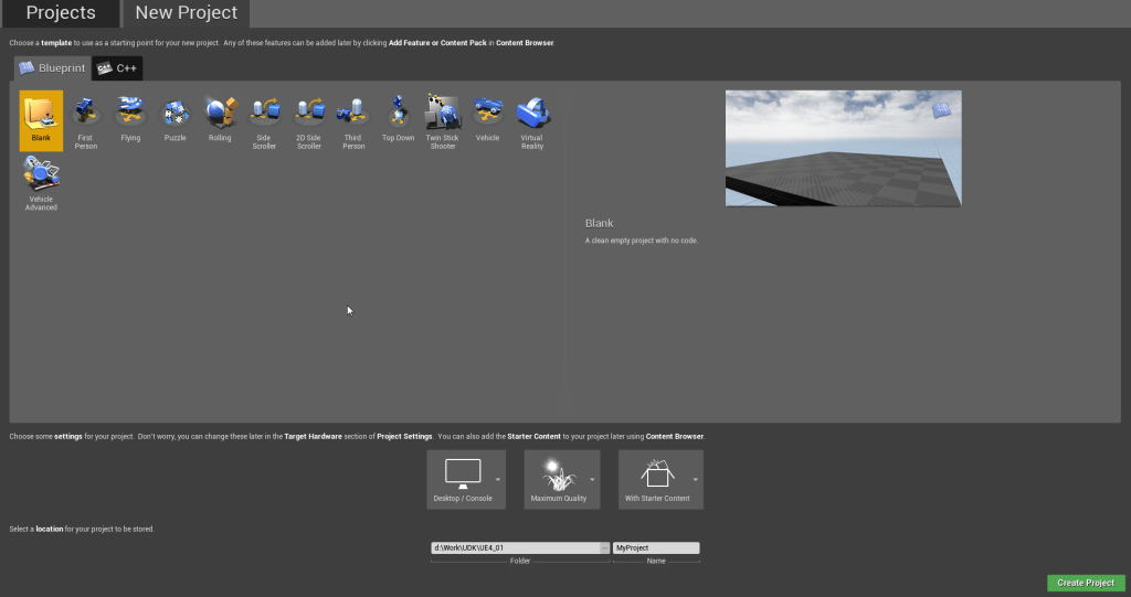 Első lépésben az előző cikkünkben alkotott széket töltsük be Unreal 4-be. Ehhez először alkotnunk kell egy új projektet, amit az Epic Launcher-ben az engine indításakor meg is tehetünk.