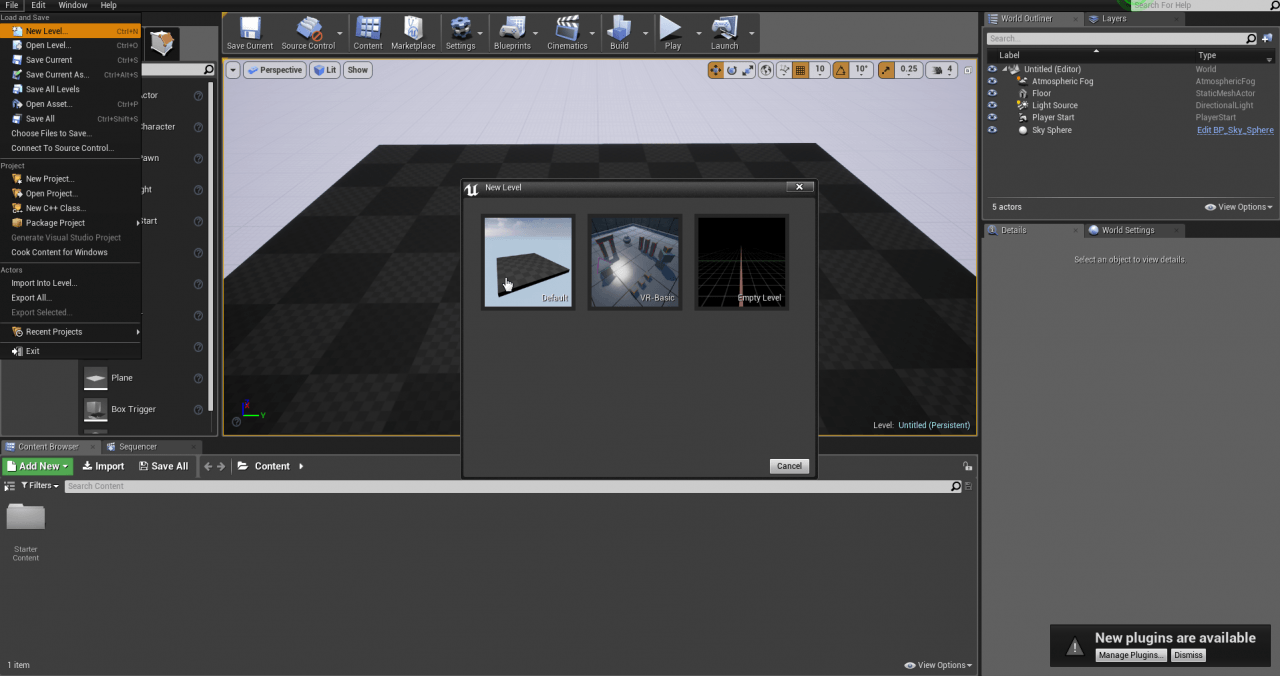 Mivel mi a saját assetünket szeretnénk betölteni, inkább alkossunk egy üres pályát, ott  kényelmesebb lesz dolgozni. A File lenyíló menüben válasszuk ki a New Level-t, és az abból megnyíló ablakban válasszuk a Default-ot.