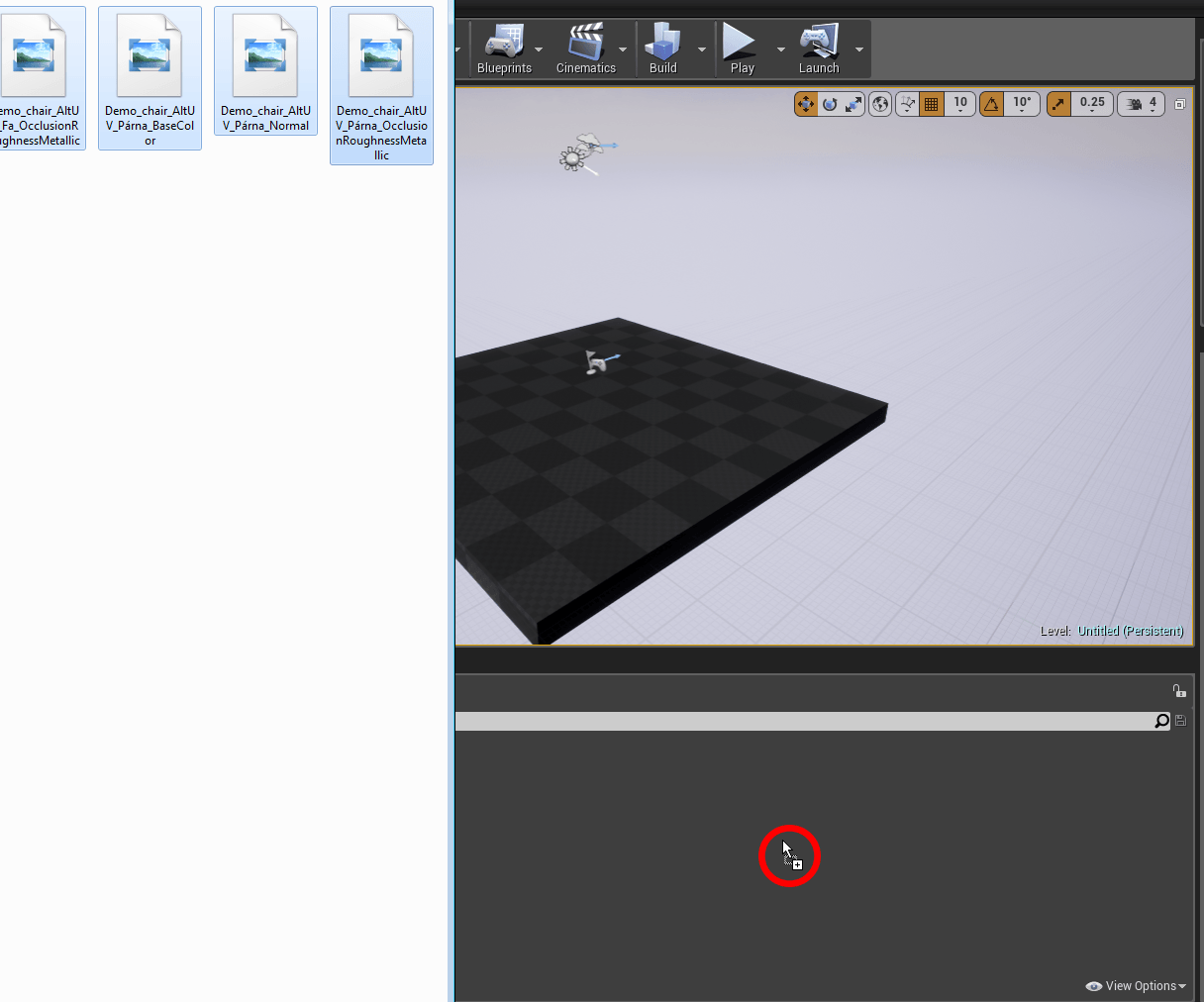 Most importáljuk be a Substance-ből exportált textúráinkat. Ezt legegyszerűbben a drag & drop módszerrel tehetjük meg — dobjuk be a kiválasztott képfile-okat az Unreal ablakának a Content Browser részébe.