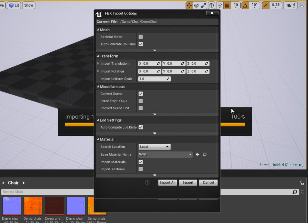 Most ugyanezzel a módszerrel importáljuk be a szék modelljét is. Mivel eredetileg egy animált, táncoló-mozgó széket kreáltunk, akár a csontokkal rendelkező modellt is betölthetnénk, mint skeletal mesh, de mi most inkább a csontoktól mentes, a Substance-hez kimentett .fbx modellt importáljuk. Az .fbx mellett használhatunk .obj-t is, viszont az utóbbinak sajnos vannak limitációi.