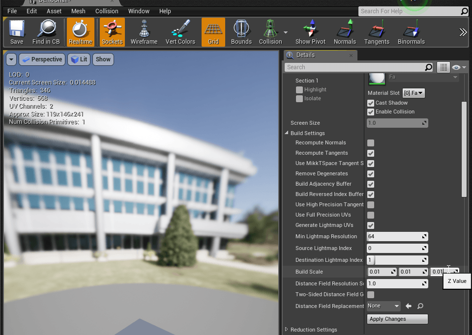 Két módon javíthatjuk: az egyik a már leírt Uniform Scale beállítás, amihez újra kéne exportálni, a másik pedig az, hogy dupla kattintással megnyitjuk a szék assetet, és a LOD0 bekezdés alatt a Build settings-ben átállítjuk a méretét — nálunk az optimális méret a 0.01 0.01 0.01 (ez Blender esetében tipikus). Ha beállítottuk, nyomjunk rá az Apply Changes-re.