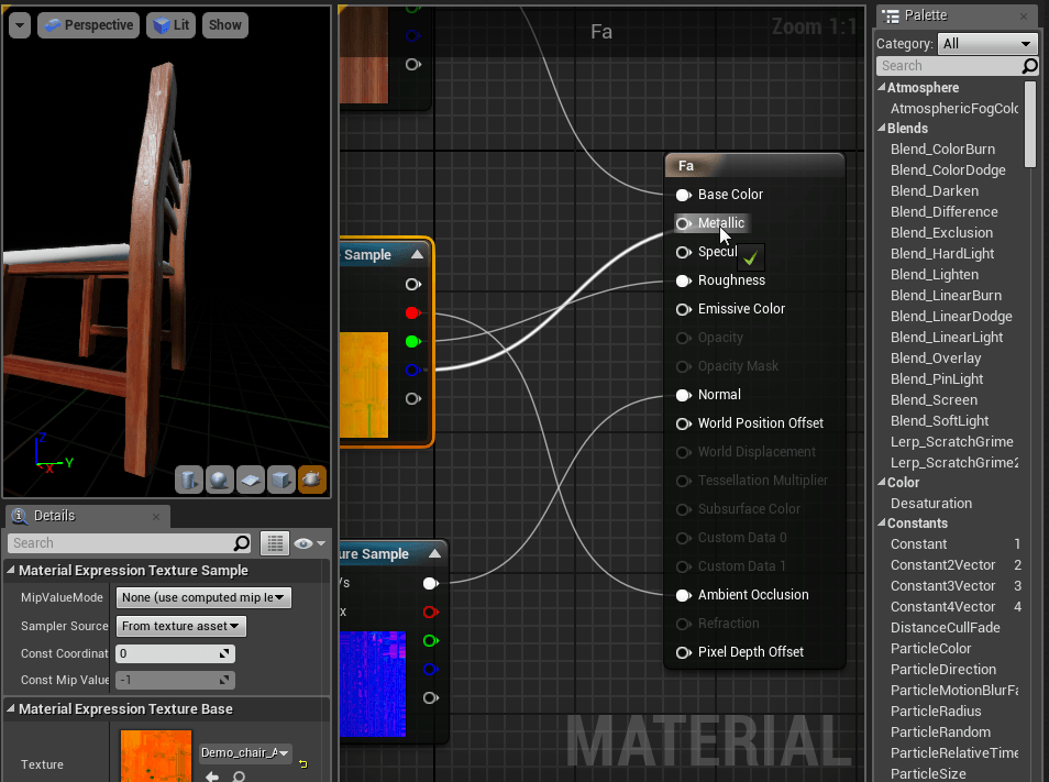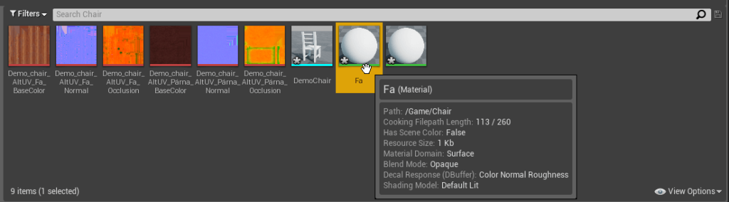 Ha megvan a szék, akkor be kell állítanunk rajta a matériákat, tehát össze kell raknunk  a textúrákat és tulajdonságaikat egy matéria assetbe. Ehhez nyissuk meg a szék Fa matériáját. Ez az import által automatikusan létrehozott üres matéria, természetesen mi magunk is készíthetünk matériát és használhatjuk bármilyen, a modelleken levő material group-on.