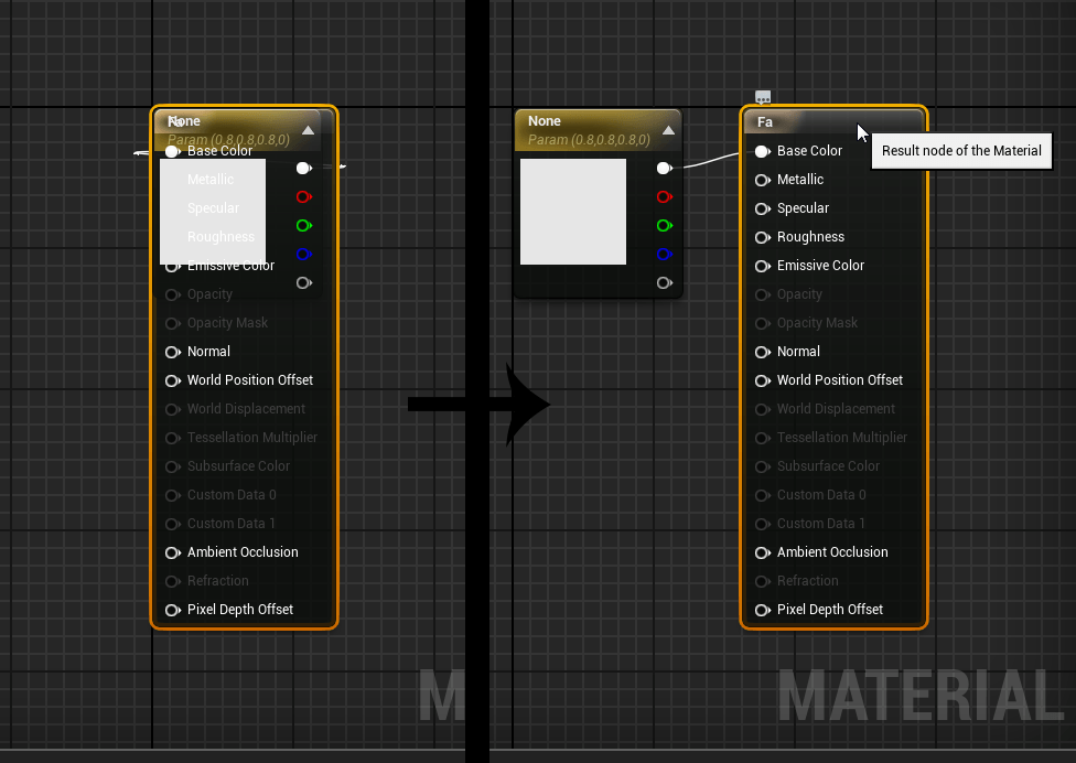 A material editort megnyitva furcsa kép fogad minket. A fehér szín 4vektor node-ja, tehát a szín node valamiért benne van az output-ban, tehát egymást takarják. Rántsuk arrébb valamelyiket a bal egérgombbal. Láthatjuk, hogy a két node össze van kötve: a None elnevezésű 4-es vektor paraméterünk fehér kimenete az Output (vagy perpillanat Fa) node Base Colorjába fut.