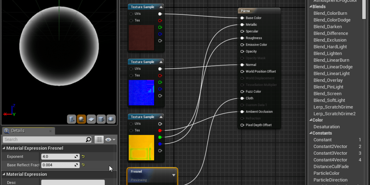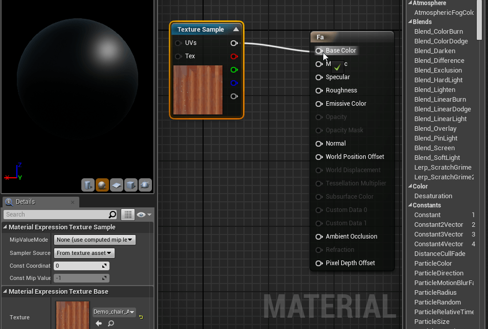 Töröljük ki a None nevű paramétert, tehát a szín node-ot. Ezután fogjuk meg a  Content Browser-ben levő Fa BaseColor textúrát, és dobjuk bele a matériába. A textúra node fehér kimenetéből húzzunk ki egy összekötő vonalat, és kössük a Base Color bemenetbe. Rövid betöltés után láthatjuk, hogy a matéria ablak előnézeti modelljén is megjelent a textúránk, mint base color.