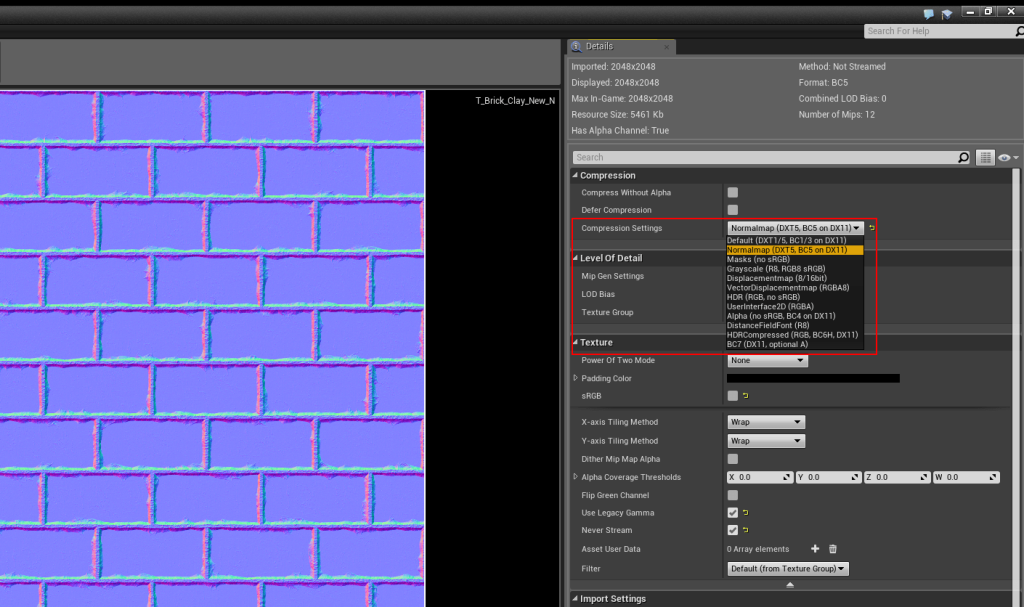 Ha a normalmap textúrára kétszer kattintva a kép beállításai között nem Normal,  hanem Default compression Setting van beállítva, fontos, hogy átállítsuk!
