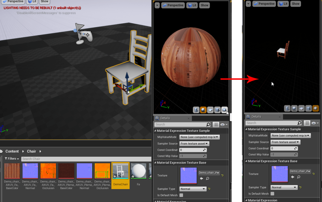 A matéria ablak bal felső részén láthatjuk az előnézetet. Alapértelmezetten egy gömb meshet használ az editor a matéria megjelenítésére — ez így nem sokat ér, mivel nem megfelelő sem a UV elosztása, sem a forma, de van lehetőségünk betölteni közvetlenül ide akár a szék meshét is. Ehhez bal kattintással jelöljük ki a széket a Content Browserben, aztán a matéria ablak előnézeti felületén kattintsunk a teáskancsó ikonra, amivel az éppen kijelölt statikus meshre cseréljük ki az eddigi előnézeti objektumot. Így mindjárt jobban meg tudjuk állapítani, hogy néz ki a matéria.