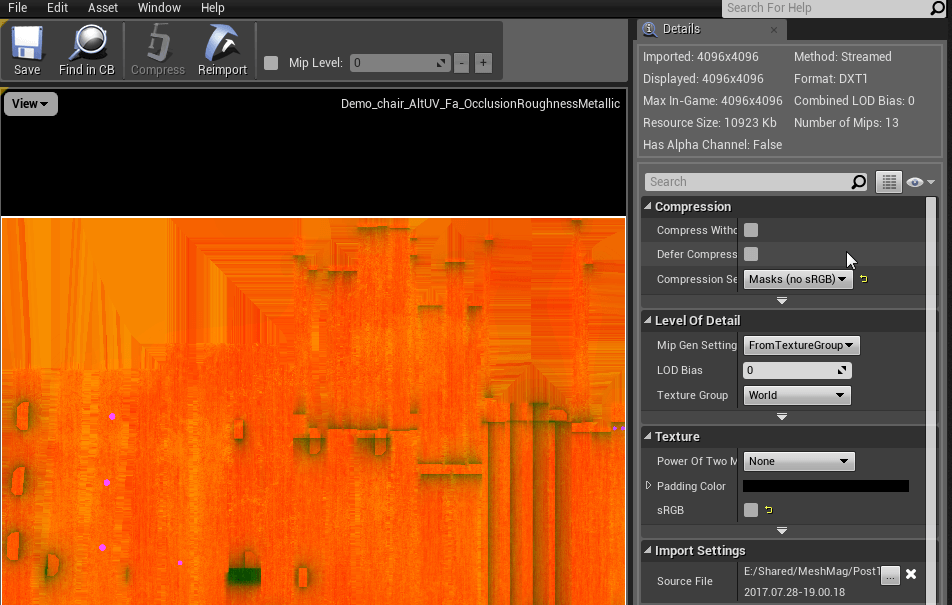 Most folytassuk a textúráink előkészítését a matériába helyezéshez. Nyissuk meg a Content Browserből  dupla kattintással az OcclusionRoughnessMetallic textúránkat. A felugró ablakban rengeteg beállítást láthatunk, amikkel finomhangolhatjuk a textúra tulajdonságait. Ahogy a normal map esetében, itt is fontos, hogy átállítsuk a Compression Settinget a megfelelő beállításra, ami, mivel ez egy csatornánként szürkeárnyalatos maszkokra bontott textúra, a Masks (no sRGB).