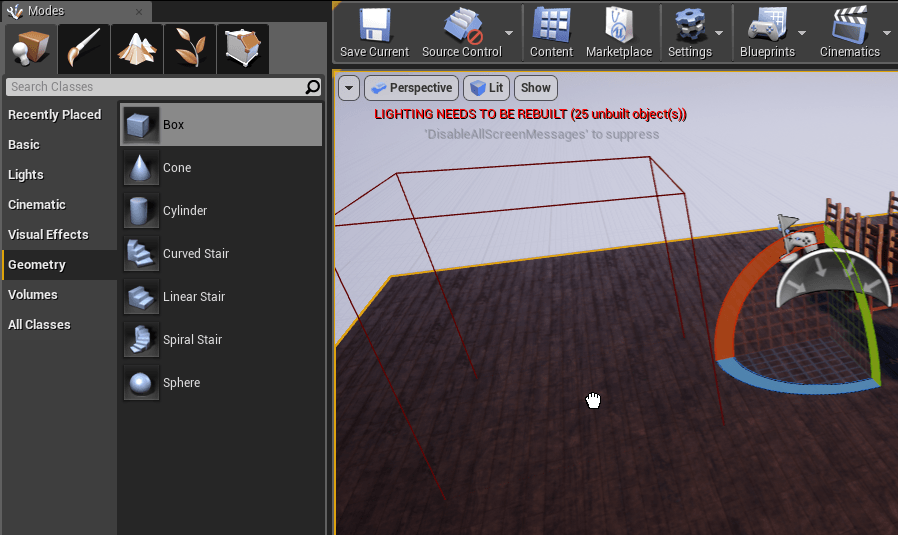 Most ismerkedjünk meg az engine-ben található Geometry móddal. Habár az Unreal 4 Geometry-nek hívja ezt az eszközt, a legtöbb másik engine-ből BSP-ként ismerhetjük. A BSP (Binary Space Partitioning), szó szerint bináris térfelosztás a játékmotorokban egyszerű geometriai formákból alkotott felületeket jelent.