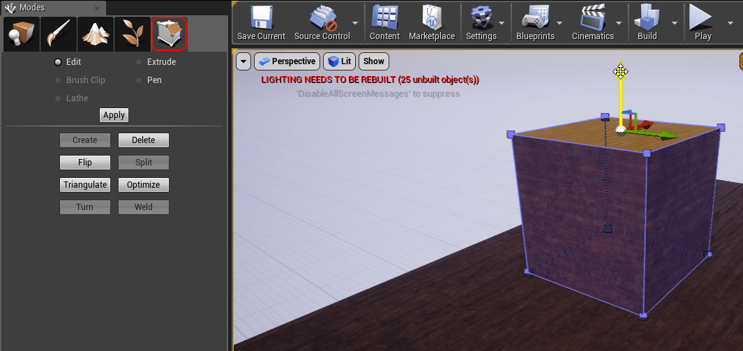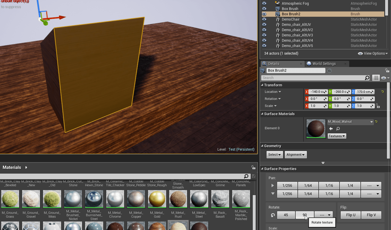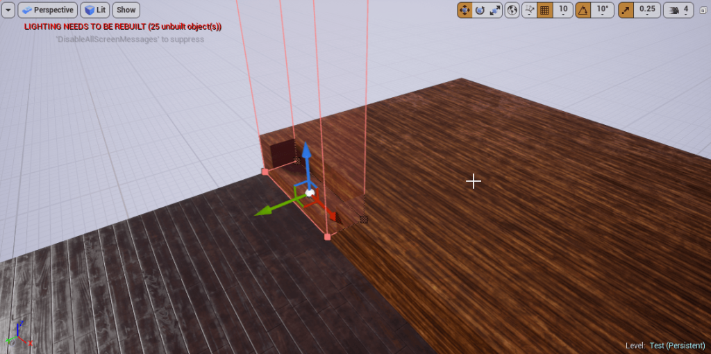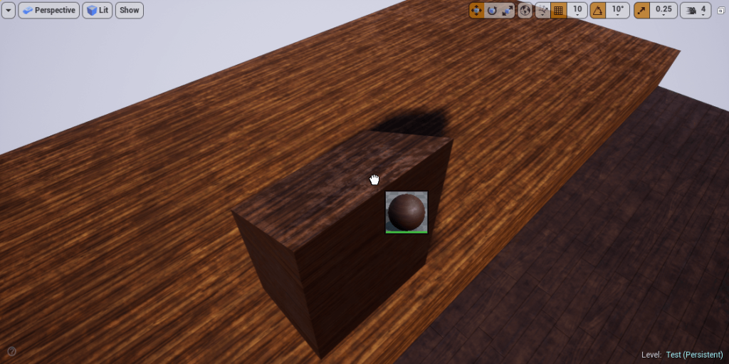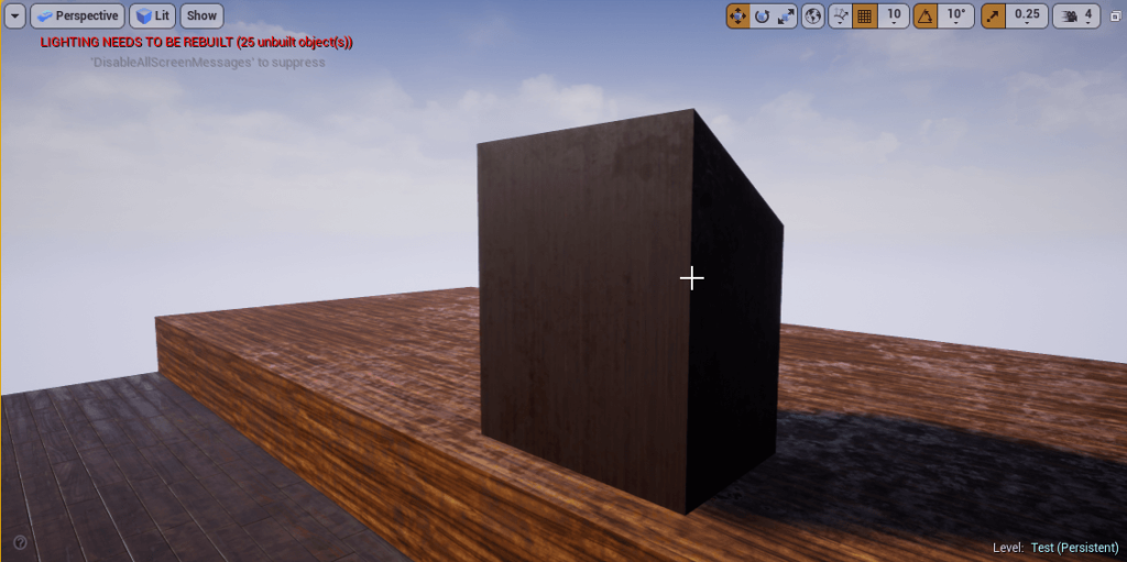 Amint leraktuk, láthatjuk, hogy a doboz felületei azonnal kitöltődtek az éppen a Content Browserben kijelölt matériával - esetünkben a fapadlóval.