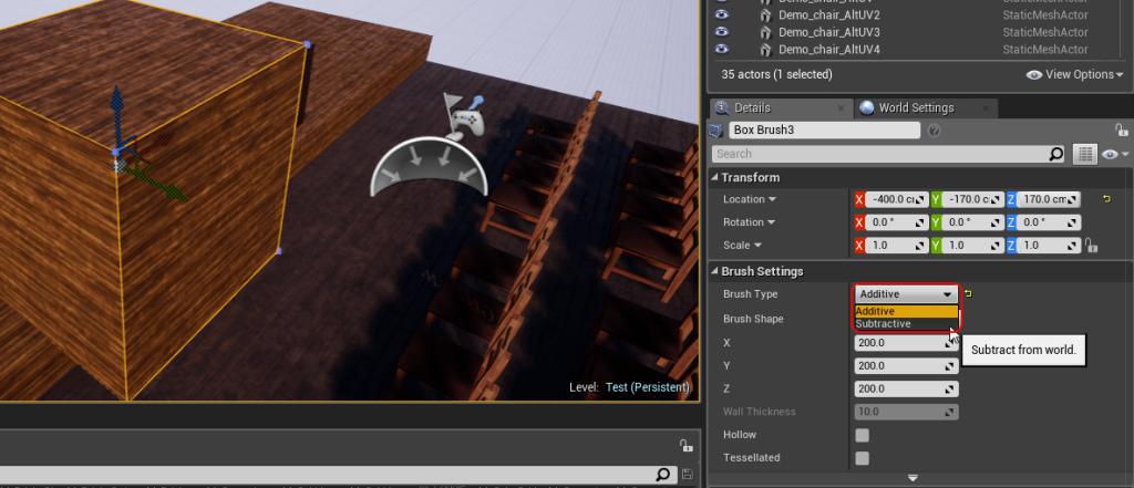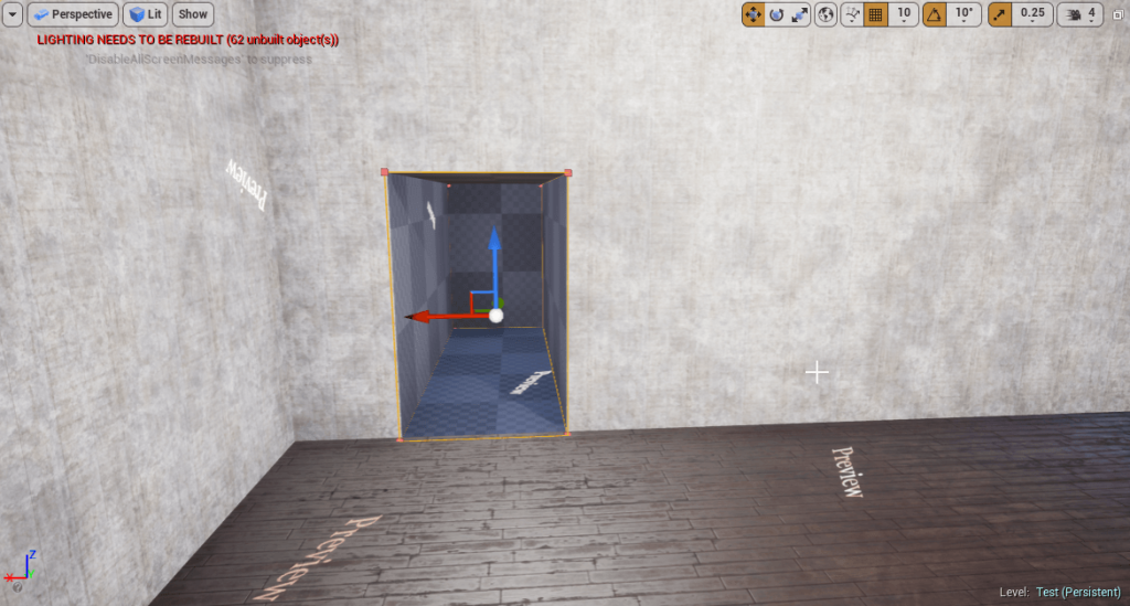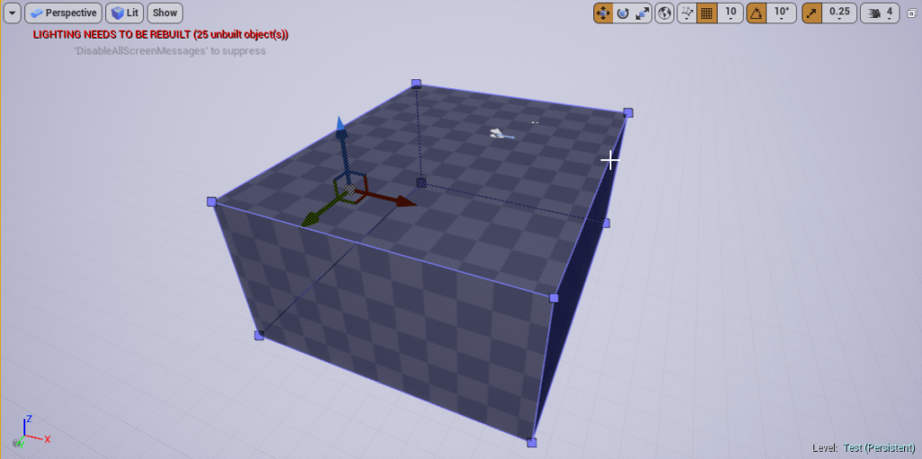 Ehhez első lépésben egy Box brush-t kell létrehoznunk a pályán, lehetőleg a szobának szánt terület közepén. Geometry Editor módban méretezzük át ezt a dobozt akkorára, hogy kényelmesen befedje a kidolgozott területet.