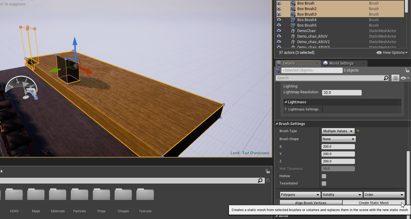 Ehhez jelöljük ki az eddig megalkotott geometriáinkat - a Subtractive-val együtt -, és a Details ablakban a Brush Settings bekezdés alján megtaláljuk a Create Static Mesh gombot.
