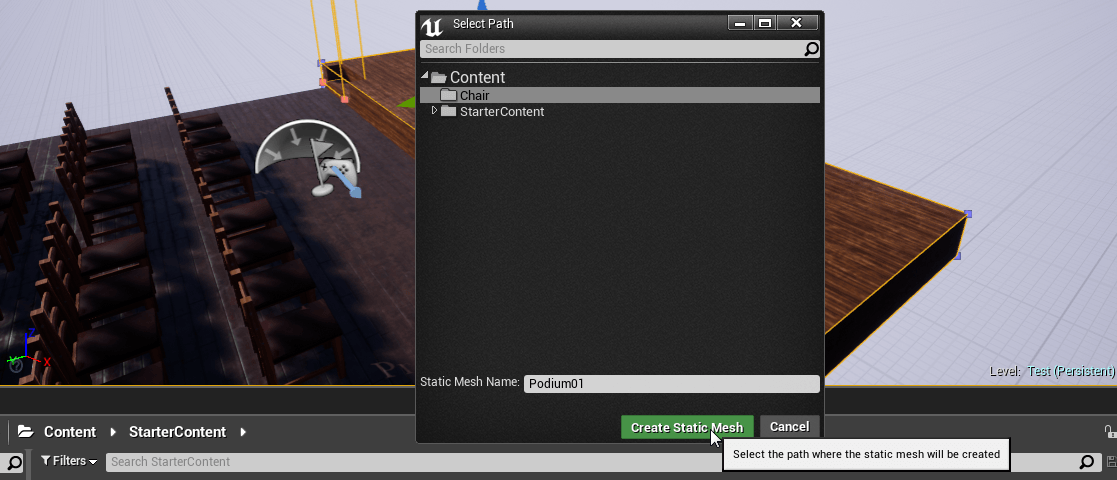 Válasszunk egy könnyen elérhető mappát a Content mappa alatt, adjunk nevet az új Static Mesh-ünknek, aztán nyomjunk rá a Create Static Mesh gombra.