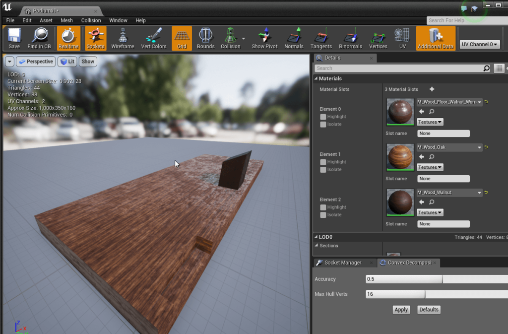A geometria felületeinek adhatunk akár külön-külön is matériákat. Megint a Content Browserből az adott assetet a felületre rádobva, pár mozdulattal kicseréltük a pódium felületét az M_Wood_Oak matériára.