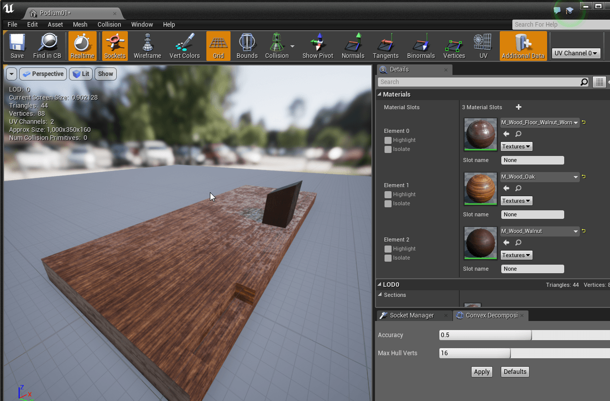 Az új Static Mesh-t megnyitva láthatjuk, hogy akár ki is tudjuk cserélni a különböző matériákat, illetve minden olyan lehetőségünk is megvan, ami kizárólag a Static Mesh actorokra vonatkozik.