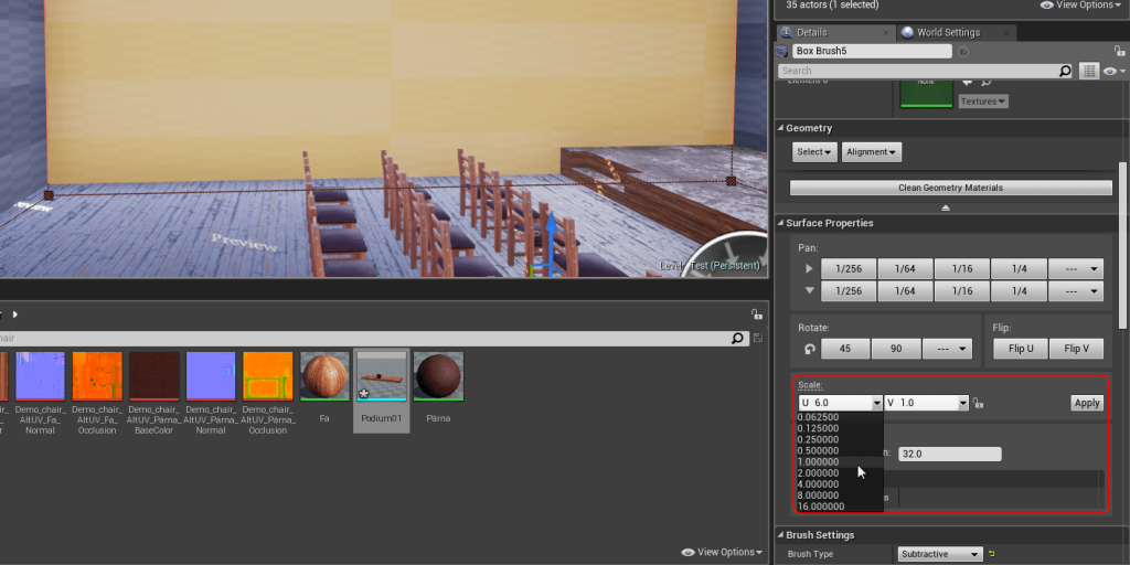 Ha megvagyunk az igazítással, láthatjuk, hogy a falakon levő alap kockás matéria nagyon  el van nyújtva. Ezt úgy tudjuk javítani, hogy kijelöljük az adott felületet a jobb egérgombbal, majd a Details ablakban a Surface Properties bekezdésben a Scale mindkét értékét 1-re állítjuk, majd rányomunk a panelen jobbra található Apply gombra.