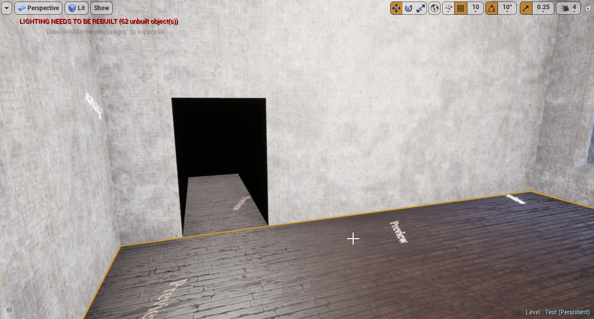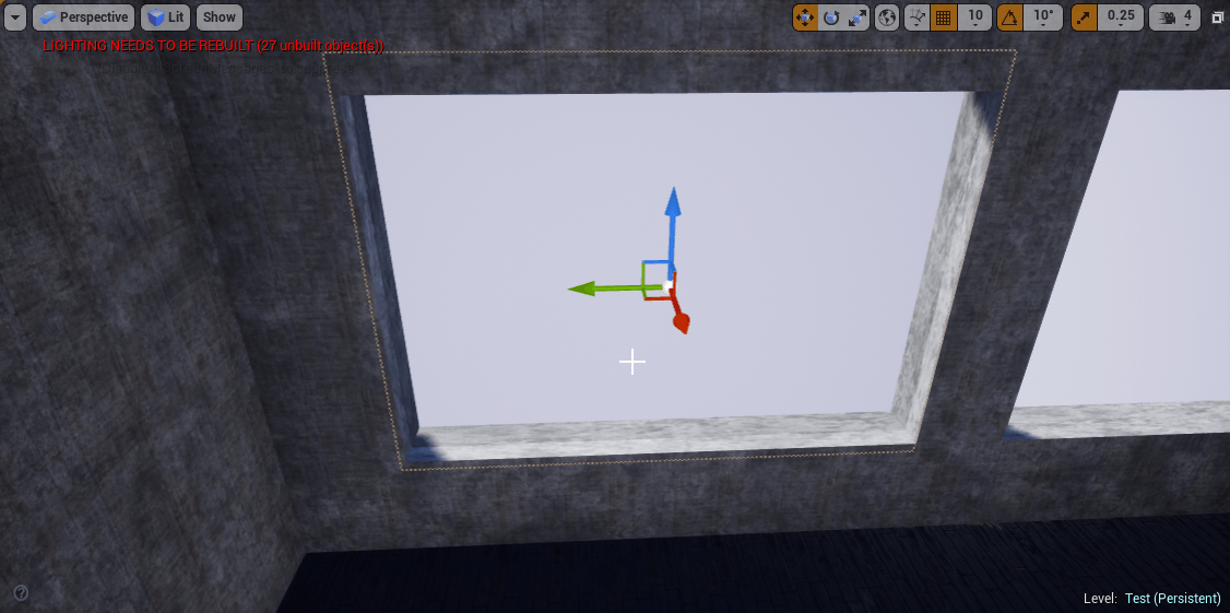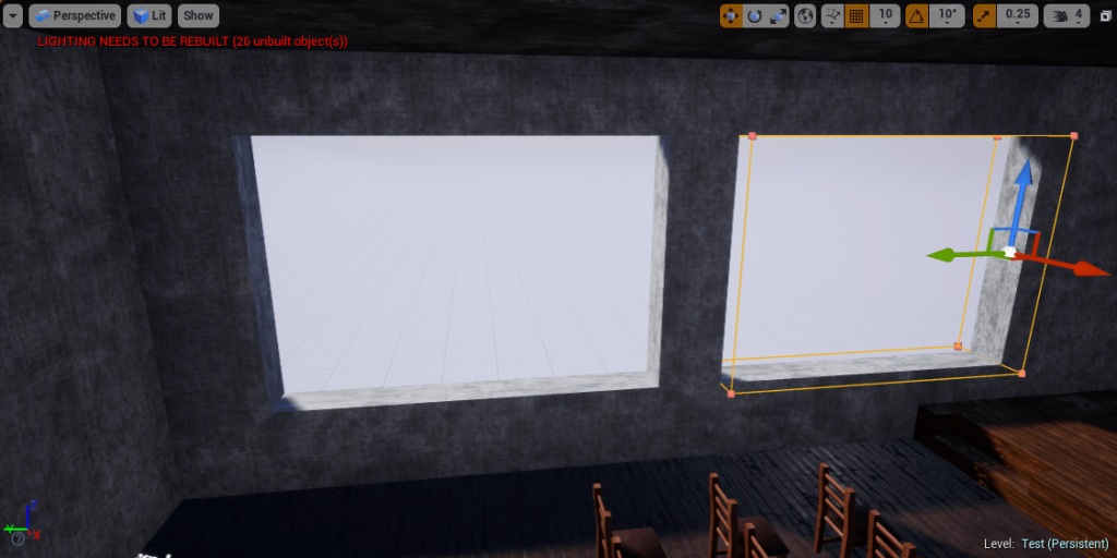 Ha ezzel megvagyunk, akkor jelöljük ki a falakat (tehát a plafont és a padlót ne), és rakjuk rájuk a Starter Content-ben található M_Concrete_Panels matériát. Mivel a padlónkat a pálya kezdésénél kapott meshből kreáltuk, és fel is matériáztuk, így már csak a plafon maradt, amire rá is rakhatjuk például az M_Concrete_Poured matériát. De milyen is lenne egy szoba ablakok nélkül? Alkossunk egy tetszőleges falra szép széles lyukakat a már megszokott szubtraktív geometria módszerrel!
