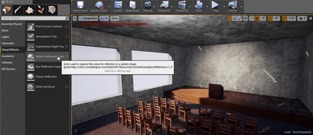 Utóbbihoz a Mode/Placement/Visual Effects alól tegyünk le egy Sphere Reflection Capture actor-t a pályánkra. Ahogy leraktuk, láthatjuk is, hogy a tükröződő felületek színe megváltozott. A Reflection Capture-t mozgatva az engine rendszeresen újraalkotja a tükröződéseket - ez tulajdonképpen úgy történik, hogy a Sphere Reflection Capture actor készít egy teljes panorámaképet a környezetéről, a saját középpontjából kiindulva, és ezt a képet használja minden, a rádiuszában levő felület tükröződésként.