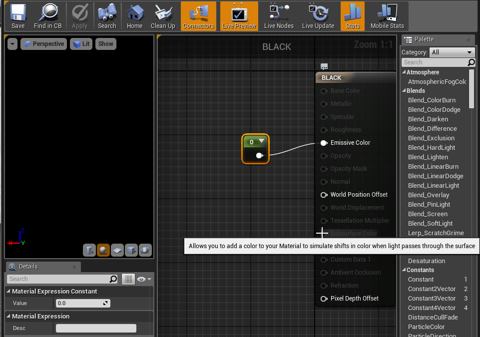 A matériában állítsuk át a Shading model-t Default Lit-ről Unlit-re. Ezek után alkossunk egy konstans értéket, ami legyen nulla, és kössük be az Emissive Color értékbe. Ennyi lenne a teljesen fekete matéria „receptje".