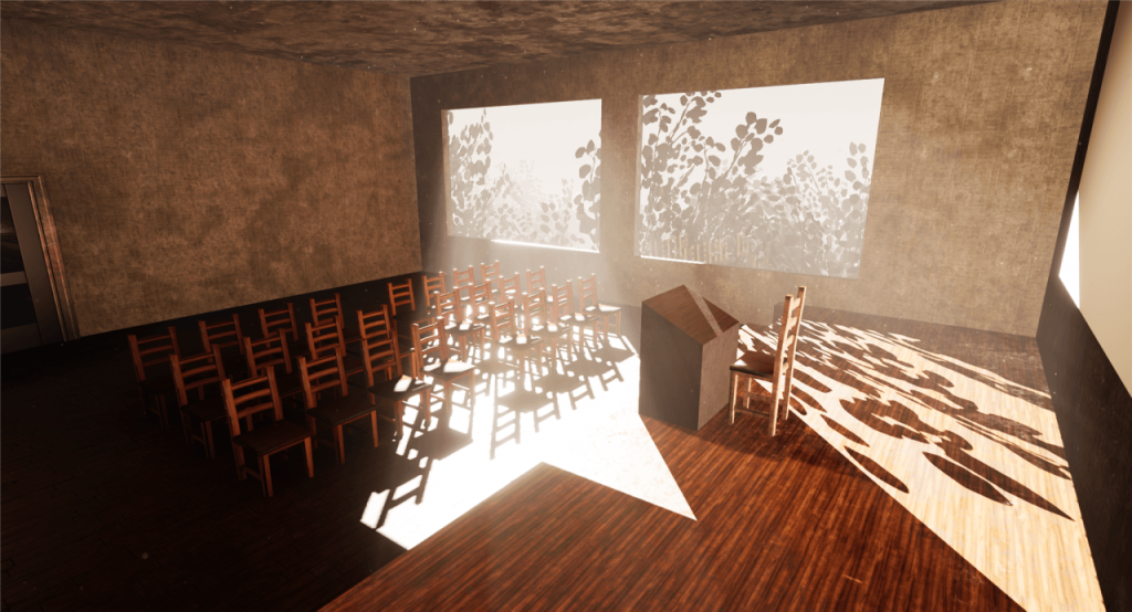 Ha ez megvan, jelöljük ki az elkészült ablaküveget, és mozdítsuk el az [Alt] gomb nyomva tartásával a másik pozíciójába. Ezzel a módszerrel egy másolatot hoztunk létre, amit elhelyezve be is ablakoztuk a szobánkat. Még így ablakokkal is kicsit sötétnek tűnik a terem, tehát tegyünk egy Point Light-ot a Mode/Placement/Lights alól a plafonra. Még javíthatunk a világításon egy spotlight-tal is, ami mondjuk a pódium mögé világít a falra. A fények Detail beállításaival érdemes próbálkozni, kitapasztalni, hogy hogy néznek ki a legjobban.