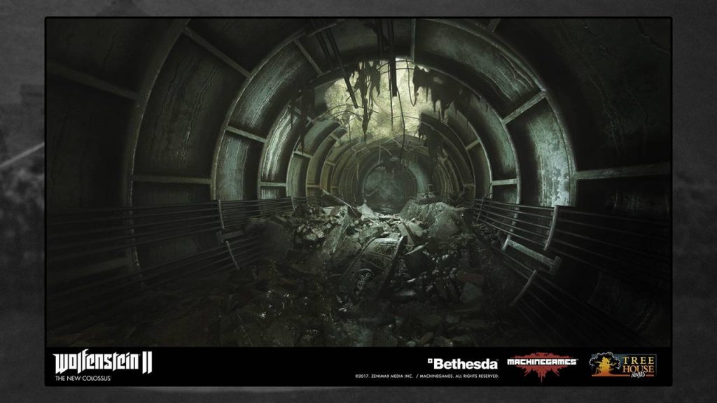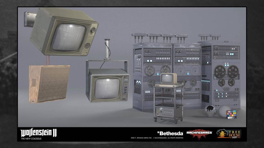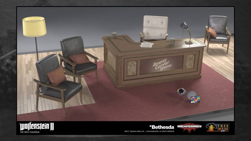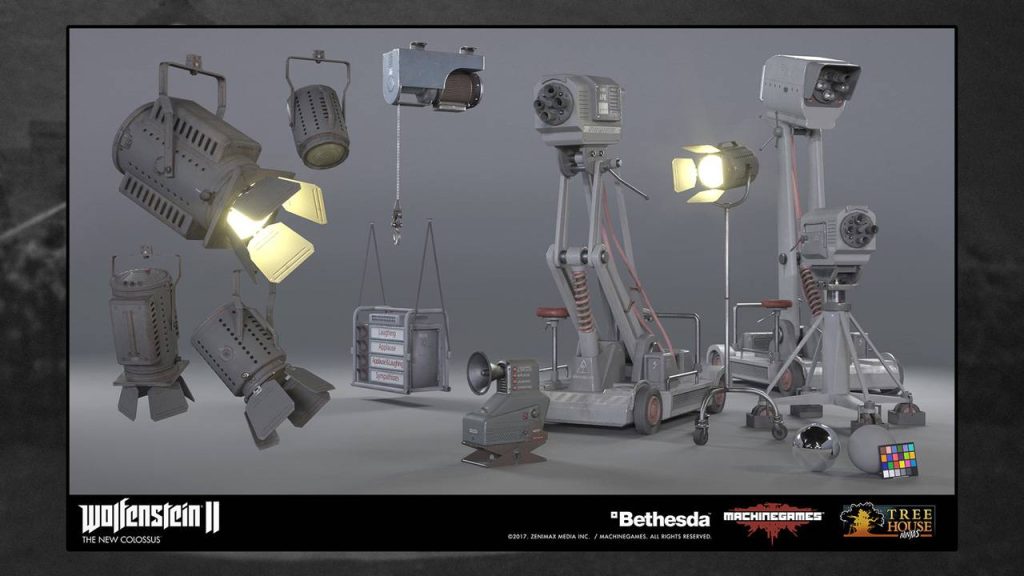 Első körben csak vázlatok, kísérleti concept artok születtek, majd ezek alapján készülhettek el a végső modellek. Csakhogy volt egy kis bökkenő – a csapat nem fért hozzá közvetlenül a Wolfenstein II szerkesztőjéhez. Így nem is kaptak azonnali visszacsatolást egy-egy munka eredményéről. Lookdevhez Substance Paintert használtak, ebben kísérletezték ki, hogy az egyes effektek hogyan viselkednek fa, műanyag, fém vagy üvegfelületeken és fejlesztették ki a saját módszereiket, hogy a lehető legközelebb kerüljenek az engine-ben látottakhoz.