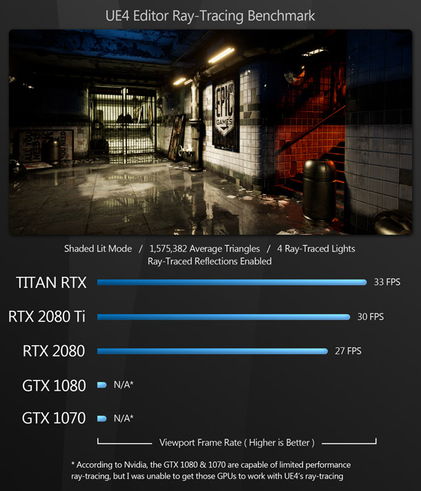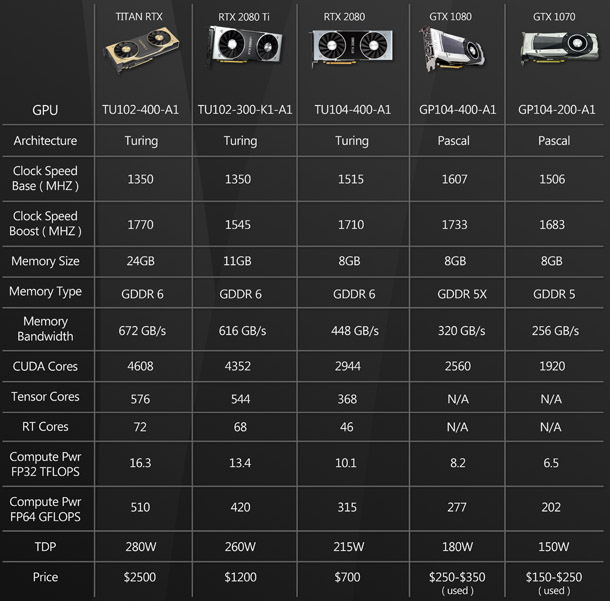 Összehasonlításképp újra fogom tesztelni a tavaly kipróbált felhasználói, illetve produkciós munkára szánt kártyákat az újgenerációs Titan RTX és a GeForce RTX 2080-at, valamint az előző generációs GeForce GTX 1080 és GeForce GTX 1070-t.