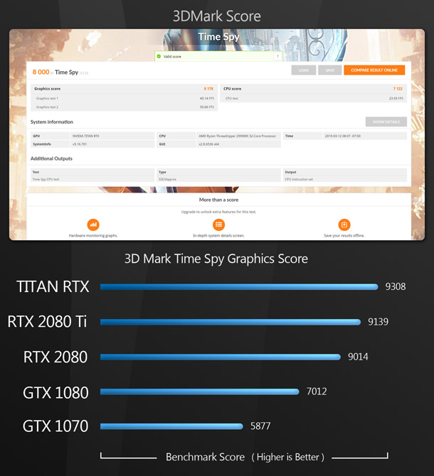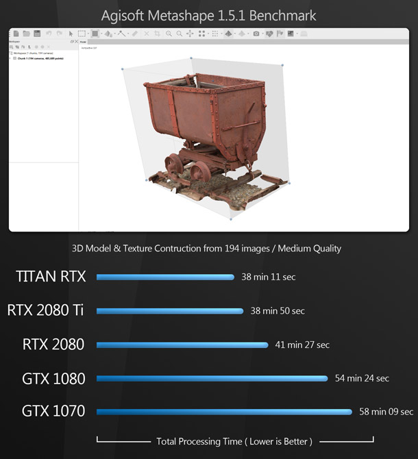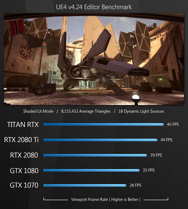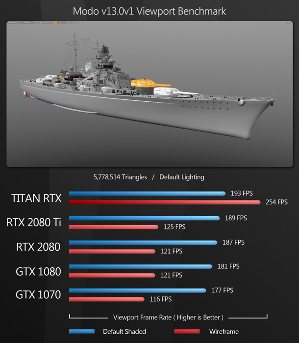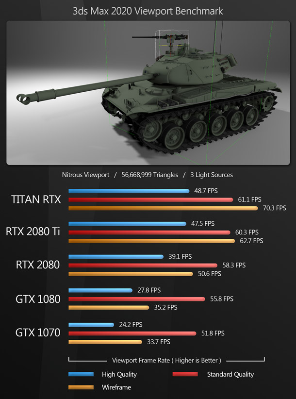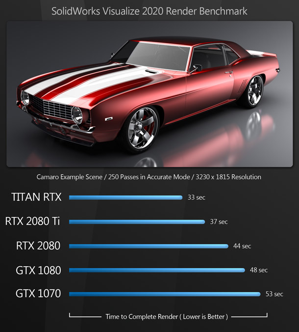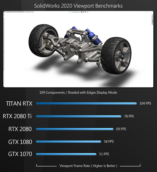 Ahogy az várható volt, a Titan RTX az összes tesztben az első helyet foglalja el, az RTX 2080 Ti -jal szorosan mögötte, kivéve SolidWorks -ben, ahol a Titan fölényesen vezet. Az RTX 2080 a harmadik helyen áll az összes tesztben, őt követi a GTX 1080 és a GTX 1070.