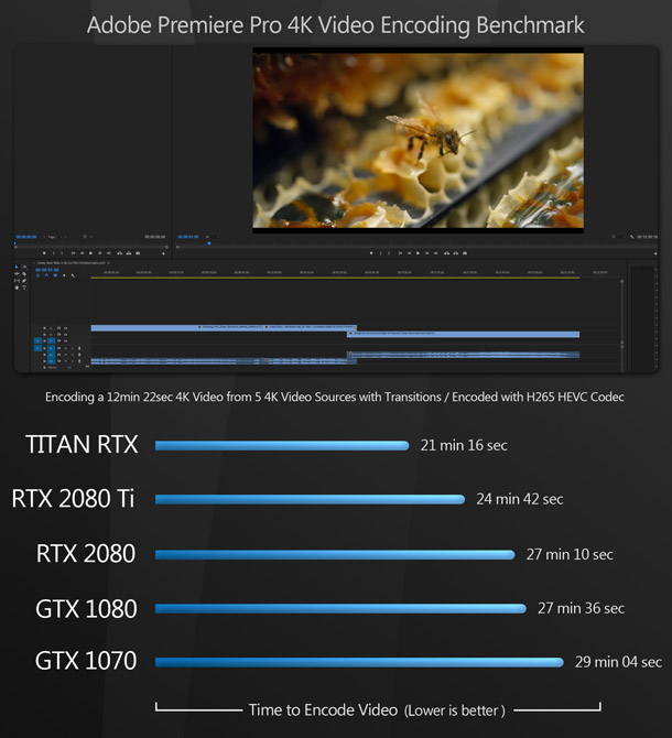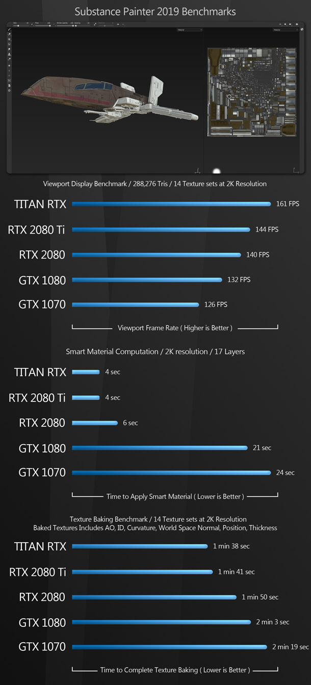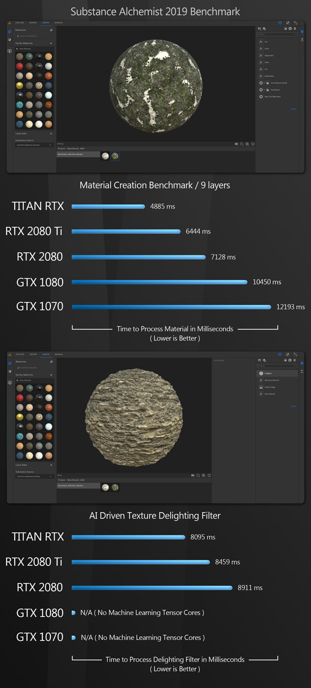 Az előző értékekhez hasonlóan a Titan RTX az összes tesztben első helyen áll, sorrendben követi a az RTX 2080 Ti, az RTX 2080, a GTX 1080 és a GTX 1070. A teljesítménybeli eltérések a Premiere Pro esetében a legkisebbek, a Substance Alchemist esetében pedig a legnagyobbak.