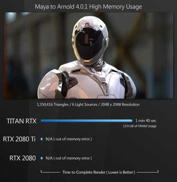 Még akkor is, ha a 24 GB-os grafikus memória némelyikét megjelenítési feladatokra használnánk, egy Titan RTX még mindig sokoldalúbb, mint két 2080 Ti, amiben csak a kiválasztott kártya grafikus memóriájának 11GB-ját használhatod renderelésre.