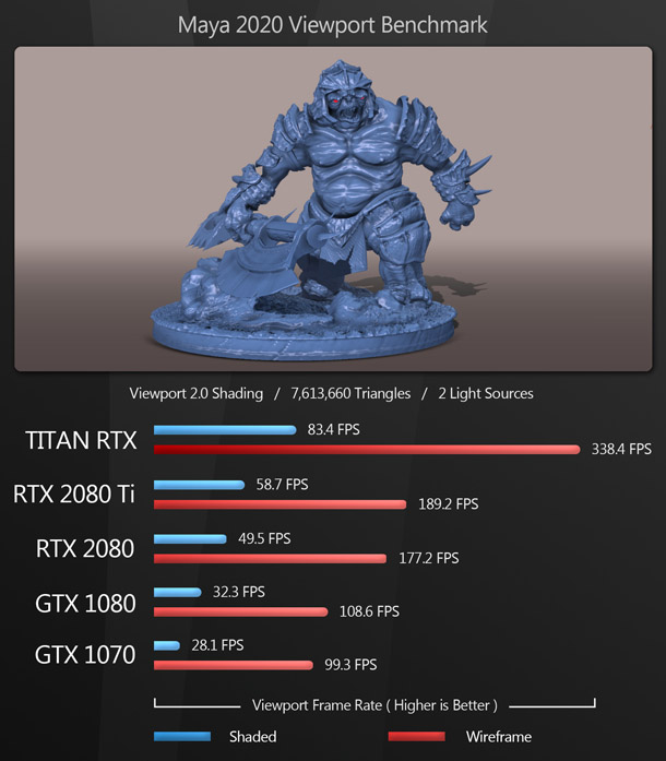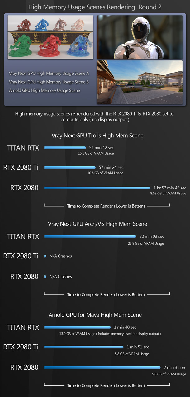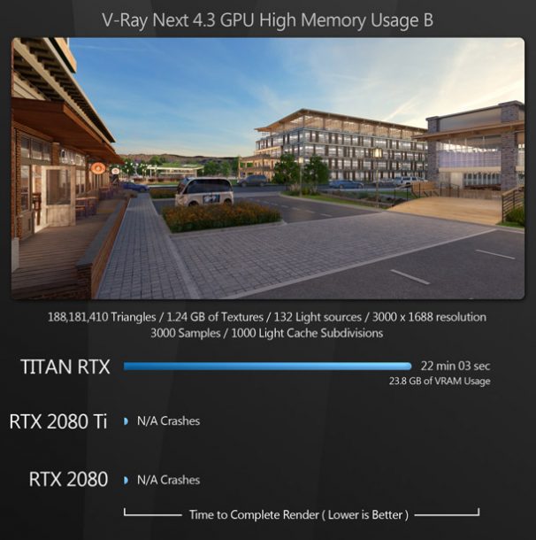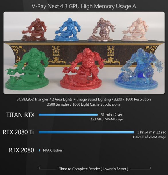 A V-Ray "trolls" jelenetében a Titan RTX – ahol az egész jelenet befért a VRAM- ba - sokkal jobb teljesítményt nyújt, mint a GeForce RTX 2080 Ti, míg a GeForce RTX 2080 egyáltalán nem rendereli a jelenetet.
