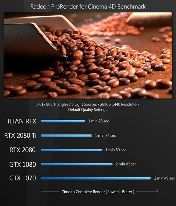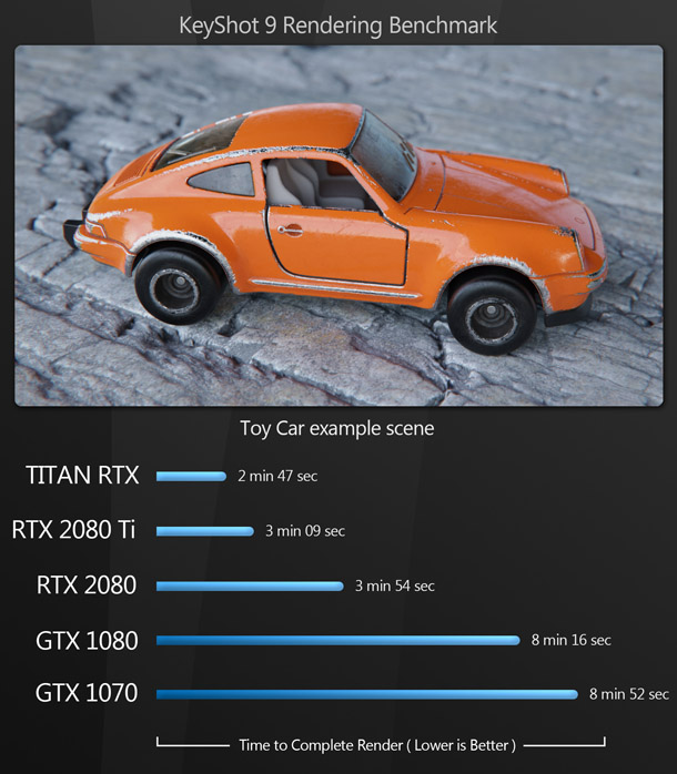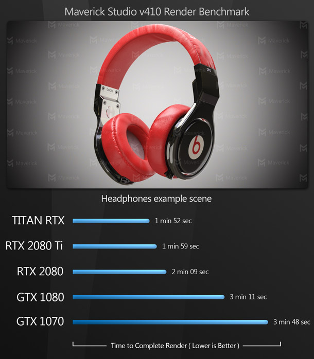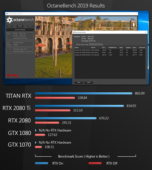 A 3D-s megjelenítéskor elért teljesítményekhez hasonló eredményeket hozott a GPU rendering közben elért teljesítmény is: első helyen a Titan RTX , bár az RTX 2080 Ti nagyon szorosan követi. A sima RTX 2080 harmadik helyen áll, amelyet a GTX 1080 és a GTX 1070 követ.