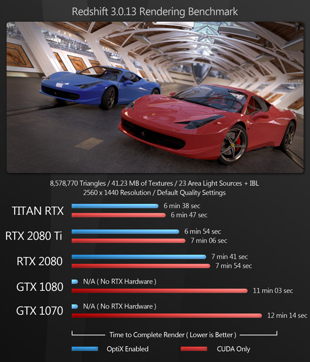Redshift esetében ez a hatás viszonylag kicsi – bár érdemes megjegyezni, hogy a 3.0 verzió még csak nemrég jelent meg. A teljesítmény V-Ray-ben a 33-35% -kal, a Blender-ben pedig 85-105% -kal növekedett.