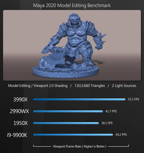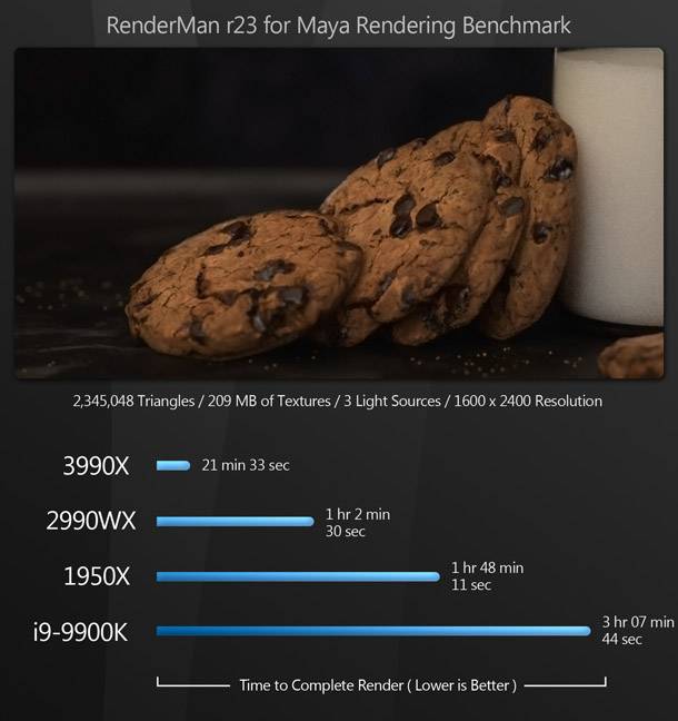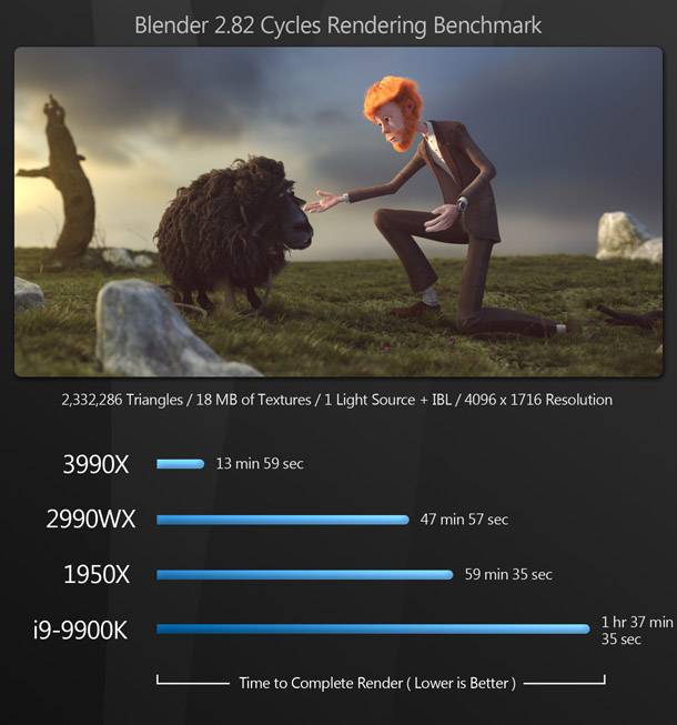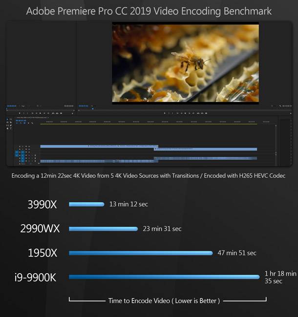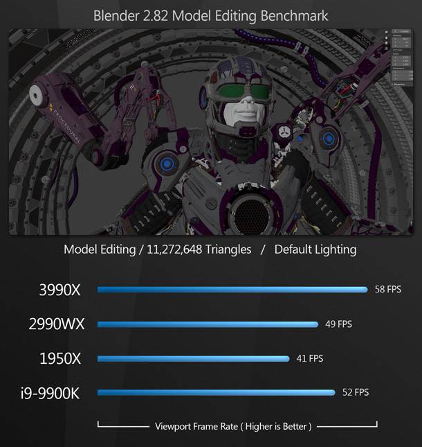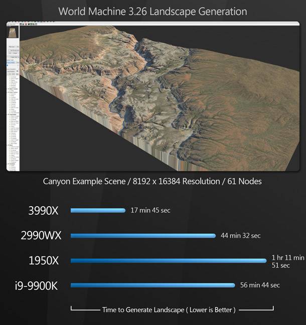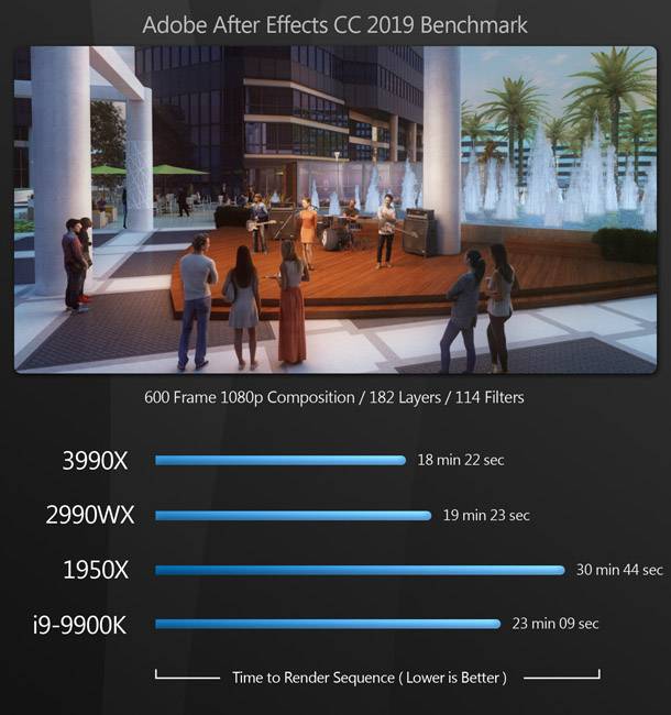 Bár a Threadripper 3990X vezeti a mezőnyt, a sokkal olcsóbb i9-9900K nagyon közel áll a 3990X teljesítményéhez. (Úgy tűnik, hogy ezek az alkalmazások, mint például a 3990X Zen 2 architektúrája jobban kitolja a határértékeit, mint a 9900K - a már felhúzott órajellel.