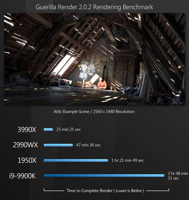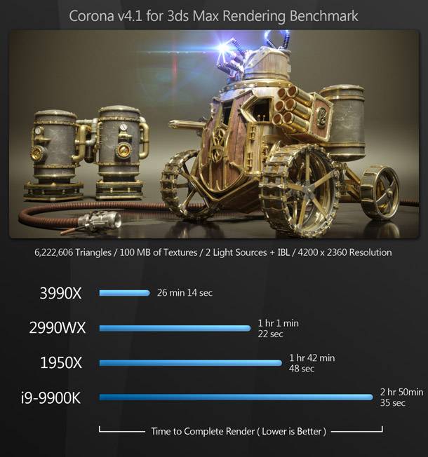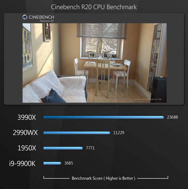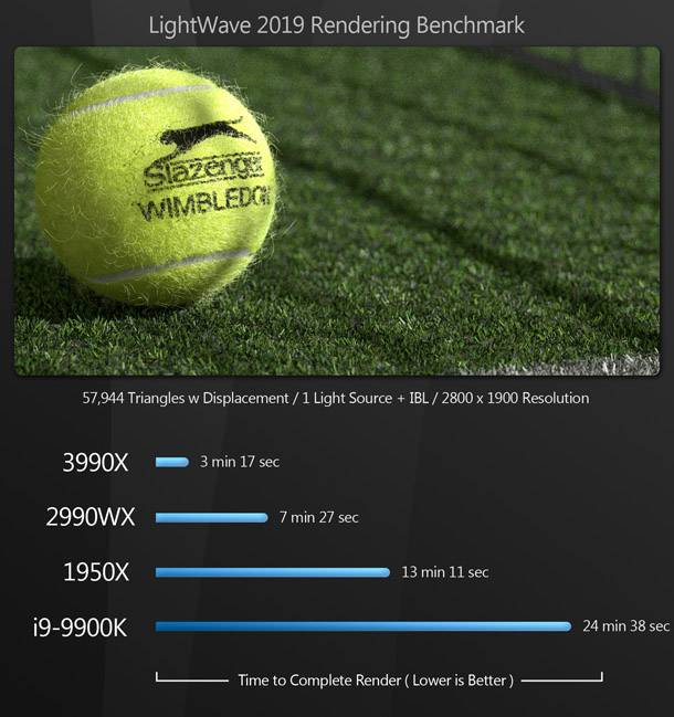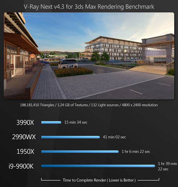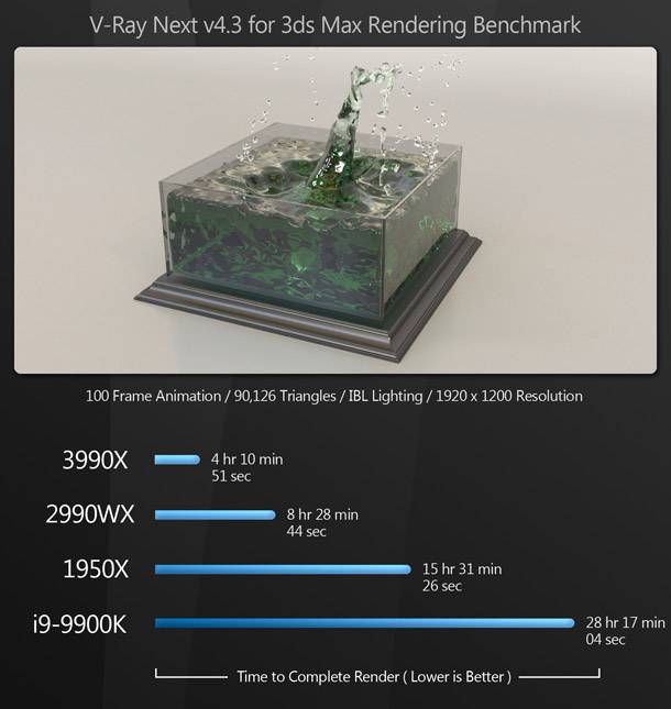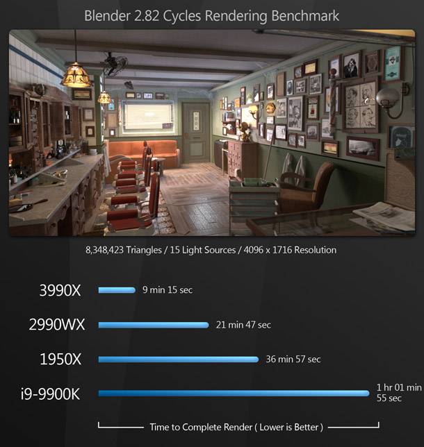 Szinte az összes rendering benchmark során a Threadripper 3990X hatalmas fölénnyel veri a többi CPU-t. A 64 magnak és a Zen 2 architektúrára való áttérésnek köszönhetően a 3990X több mint megkétszerezi az előző generációs 2990WX teljesítményét, és maga mögé utasítja a 16 magos 1950X-t és a 8 magos 9900K-t.