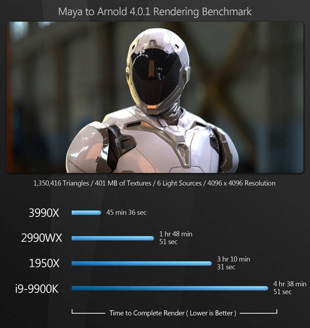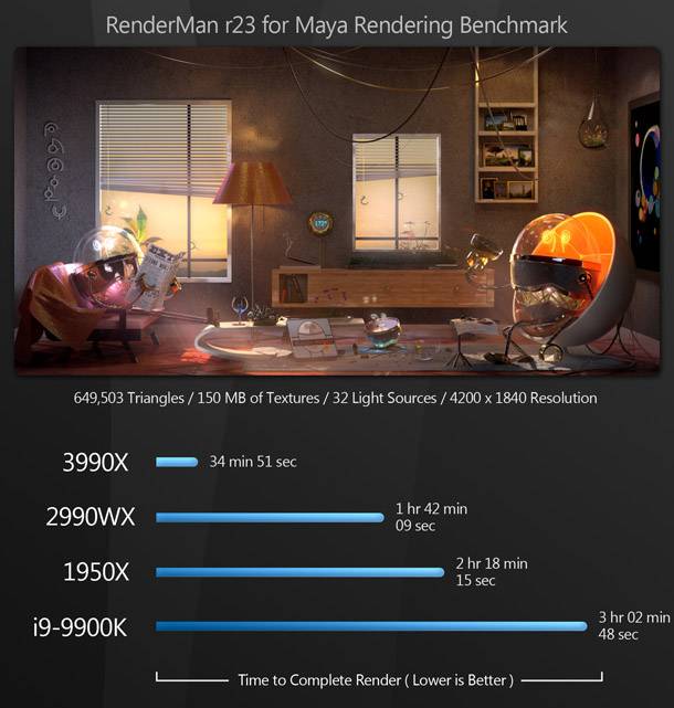 Noha nagyon jól alkalmazkodik az kevés szálat igénylő alkalmazásokhoz is, ilyen jellegű munkákhoz a teljes Threadripper sorozat sokkal több mint fölösleges. Ha csak egy munkaállomást keresel 3D modellezéshez és textúrázáshoz, vagy a Photoshop és az After Effects munkát végzel, akkor még a 64 magos processzor sokkal több, mint amire szükséged van: sokkal olcsóbb CPU-k vannak, amelyek ugyanolyan jól fogják elvégezni a munkát, és néhány esetben valószínűleg egy kicsit még jobban is. De olyan feladatokhoz, mint a bevilágítás és a kinézet fejlesztése, anyagok és az shaderek készítése, szimuláció és eszközfejlesztések, a jelenet gyors iterációjának lehetősége rendkívül értékes, és nagy-nyomás alatt lévő produkciókban a 3990X egyszerűen igazolja költségét.
